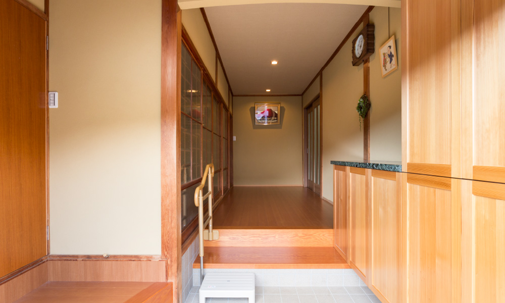 昔ながらのお屋敷で玄関と台所が土間にあり履物を履いて移動せねばならず、座敷とは50センチほどの段差があるなど、不便を感じていたS様。お孫さんとの同居をきっかけに、既存のダイニングキッチンと応接間を一体のLDK空間に。土間部分はフローリングの廊下とし移動もスムーズになりました。段差も少なく、三世代が心地よく過ごせる住まいに生まれ変わりました。