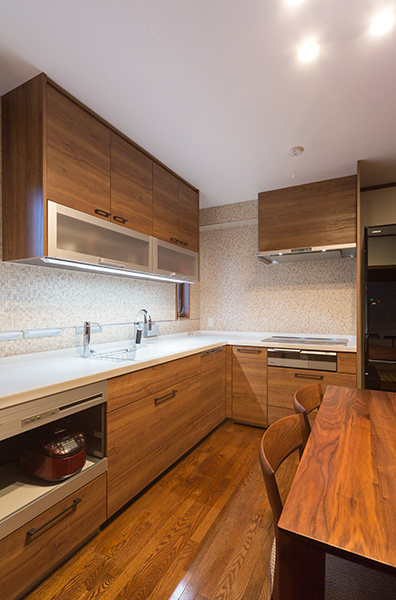 既存のI型キッチンに不便さを感じていたK様。冷蔵庫スペースが壁に囲まれ、造作のダイニングテーブルが固定で動かせないなど、使い勝手の面で不満があったといいます。そこで、あまり使われていなかった勝手口は撤去し、L字型のキッチンカウンターを採用。家電収納やゴミ箱スペースもすべて組み込まれ、すっきりと機能的なキッチンへと生まれ変わり、奥様も大満足です。