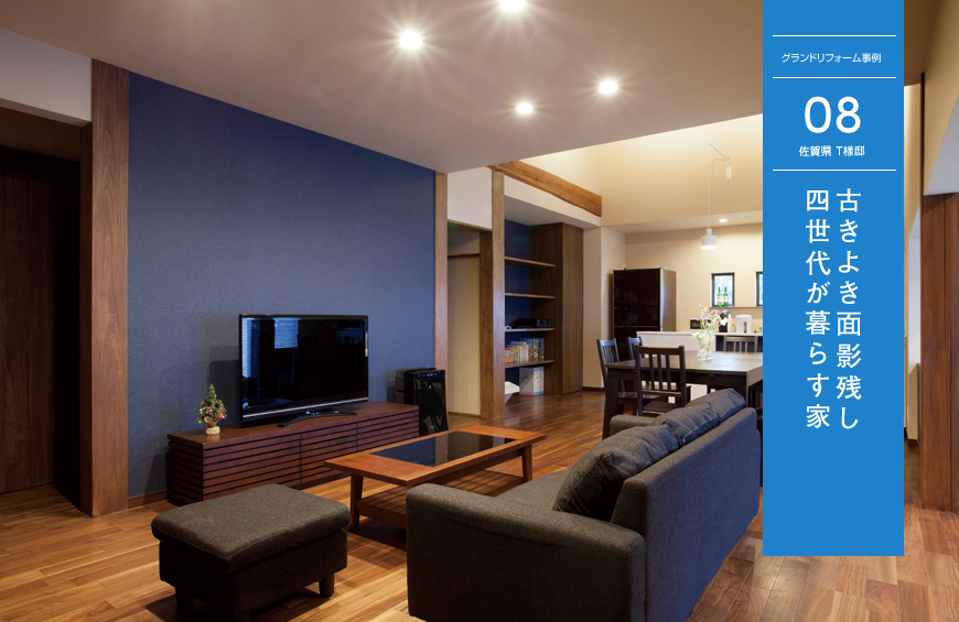 三世代で住まわれていたところにお孫さん一家も同居することとなり、四世代10人で暮らせる大規模リフォームを決意したT様。「古い家を大切にしたい」と、柱や梁などを随所にいかし、既存の和室と廊下を一体にして広いLDKを実現。LDKとつながる広い縁側部分は仏間に変更。家族みんなが集う場所となりました。また、トイレを1階と2階に2ヵ所、洗面所は3ヵ所設置し、大家族ならではの問題も解決。それぞれのライフスタイルに合わせ、家族仲良く暮らせる家となりました。