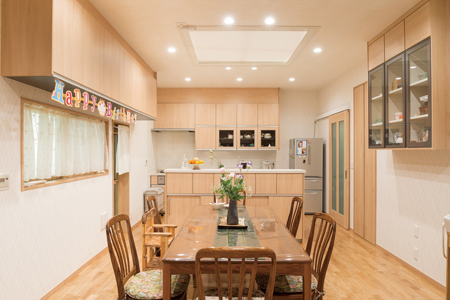 息子さんご家族との同居を機に、リフォームを決めたG様。お孫さんが走り回っても大丈夫なように、リビングとダイニングの間仕切り壁を取り払い、安全で広々としたLDKを実現しました。リビングにはシステム収納を設置。キッチンにも家電収納やカップボードを備えて、キッチンまわりをすっきり。ほぼ全面に床暖房を設置して、冬場でもポカポカです。お孫さんが遊ぶ姿を、調理しながら安心して見ていられるようになりました。