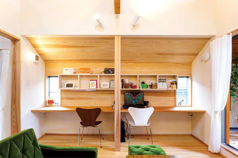 それぞれのテラスに植栽が置かれ、「家の中のどこにいても緑を感じられるのが嬉しい」とご夫婦ともに大満足。また、屋根を架け替えたことでキッチンとリビングを勾配天井にし、開放的で気持ちのよい空間となりました。天窓から明るい日差しが降り注ぐリビングには、ブックカフェのようなコーナーが設けられ、夫婦のくつろぎタイムを贅沢に演出しています。