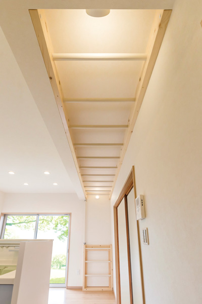 木目と白を基調にした明るいM様邸のダイニングキッチン。つい見上げてしまう天井脇にかけられた雲梯が特徴的で、じつはこれ、ご主人が遊び盛りの小学生のお子さんのためにリクエストされたもの。