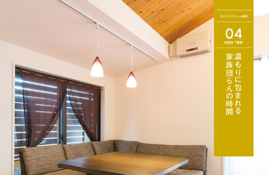 孤独だった料理の時間が、家族とのコミュニケーションの時間に変わりました」と笑顔を見せる奥様。増築により広くなったダイニングキッチンは、開放的なオープンスタイル。機能的な動線で使い心地もアップし、ダイニングにいる家族と会話を楽しみながら料理ができるようになりました。天井高を上げたことで光に包まれた気持ちのよい空間となり、天井と床に用いられた無垢材の自然な温もりが、この場所に集まる家族を癒してくれます。