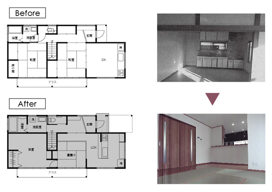 両親が所有していた築40年の貸家を引き継いだY様。当初は、建て替えを検討していたものの、間取りの変更と設備の交換で明るい空間に生まれ変わるという提案を受け、LDKのリフォームに方向転換。トイレやバスルーム、キッチンなど古くなった水まわり設備を交換しつつ、キッチンの配置を変更して、ダイニングの壁を撤去。風通しがよく、窓からの光が部屋全体に回る、明るいLDKになりました。