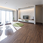 細かい間取りを一体化して大リビングに。構造的にどうしても残さなくてはいけない柱を利用して、最適な場所に収納を設置しました。ご家族でよくリゾート地へ出かけられるというお話から、床や壁のカラーコーディネイトや素材を工夫し、オリエンタルな雰囲気を演出しました。
