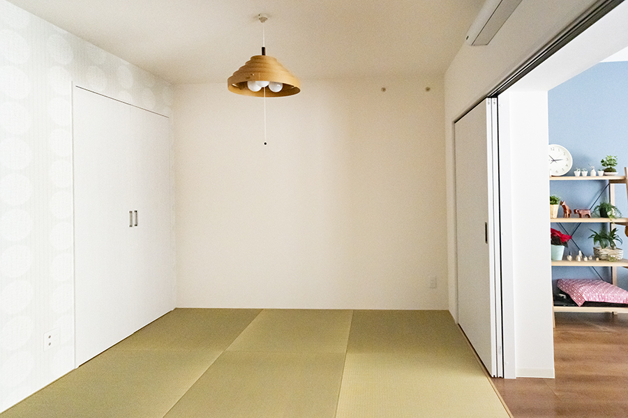 和室は引き戸を開ければリビングとして、来客時などは閉めて使うこともできます。光が入らなかったキッチンは壁を取り払い明るく。ダイニングにお子様の学習机を設置し、家族が集まる空間に仕上げました。将来お子様がご自分の部屋を持つときに備え、書斎にも収納を設けました。
