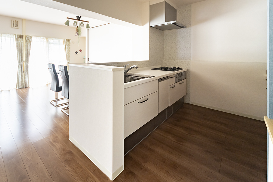 築32年のマンションをご購入されたO様は、まだ幼いお子様たちの成長や、ご家族のライフスタイルに合った間取りにリフォームして住み替えをされました。キッチンは広々とした対面式に。隣接する洋室を取り込むことで、広いLDKが誕生。和室の引き戸を開放すれば、約20畳にもなる大空間が広がります。ダイニングの横にはお子様の学習机も設置。インナーテラスからのやさしい光が入り、家族が自然と集まる開放的で明るい空間になりました。
