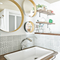 ヴィンテージ感溢れるインテリアの方向性を決定づけたのは、ある建具屋で見つけたアンティーク扉。逆算してその扉にぴったりのヴィンテージ空間をつくり上げるため、担当者といっしょに建具・建材ショップを回り、壁紙やタイルなど細部に至るまで選び抜きました。S様がもうひとつこだわったのは、メンテナンスのしやすさ。リビングの床材は埃が目立たない色みで、経年で味わいが増すものを選び、洗面所のシンクは水が飛び散りづらいよう、大きいものを探しました。レンジフードは10年掃除不要のモデルを選んでいます。