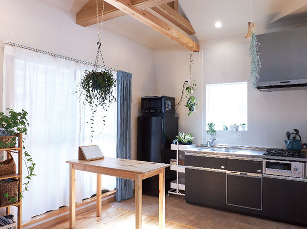 天井を高くしたキッチンが、こんなに広々して気持ちがよいとは思いませんでした。和室の窓の眺めに加えて、この眺めも好きです。山荘にいるような眺めのよい空間で緑に囲まれた暮らしを楽しんでいます。