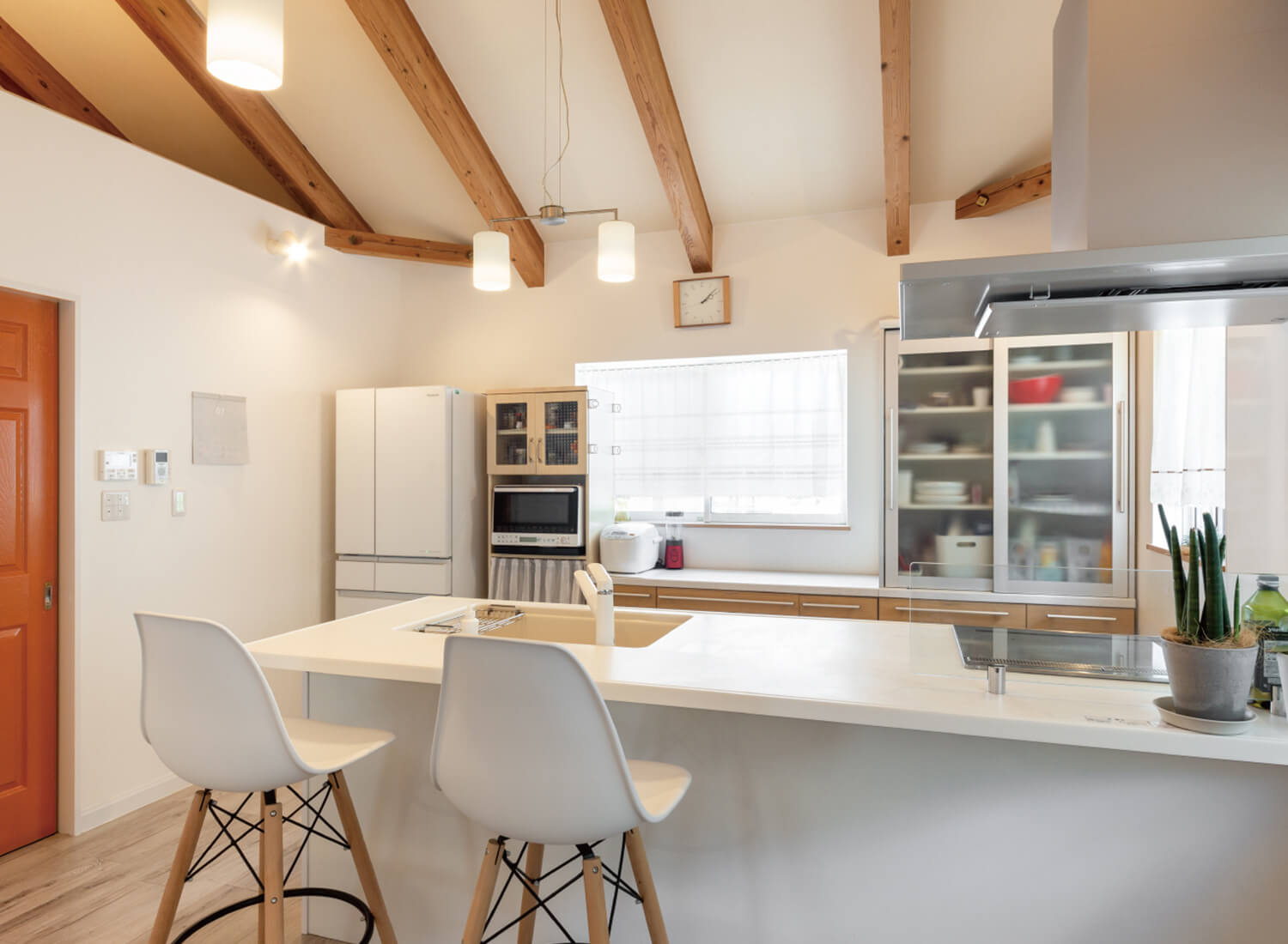 料理好きのN様ご一家。通路を広めに確保したので家族一緒に料理ができます。キッチン扉は天井梁と調和する木目調に。