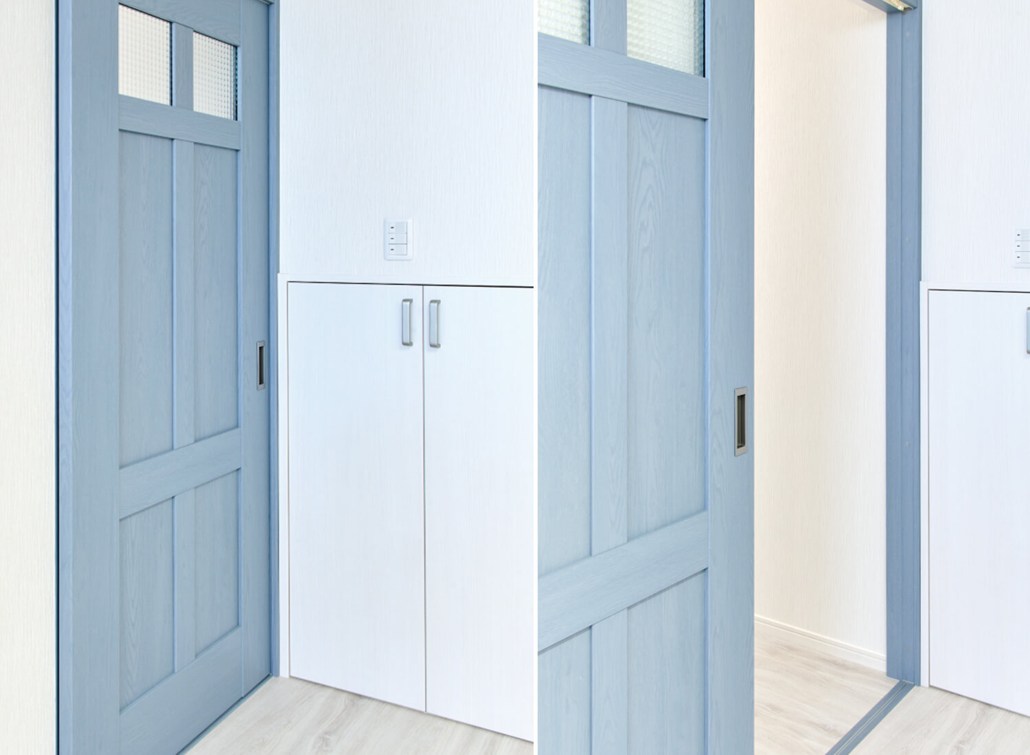「クラフトレーベル」の建具はキッチン扉柄と色を合わせました。下枠までカラーを統一したことで、ドアを開けていても廊下との境界線をさりげなく演出。