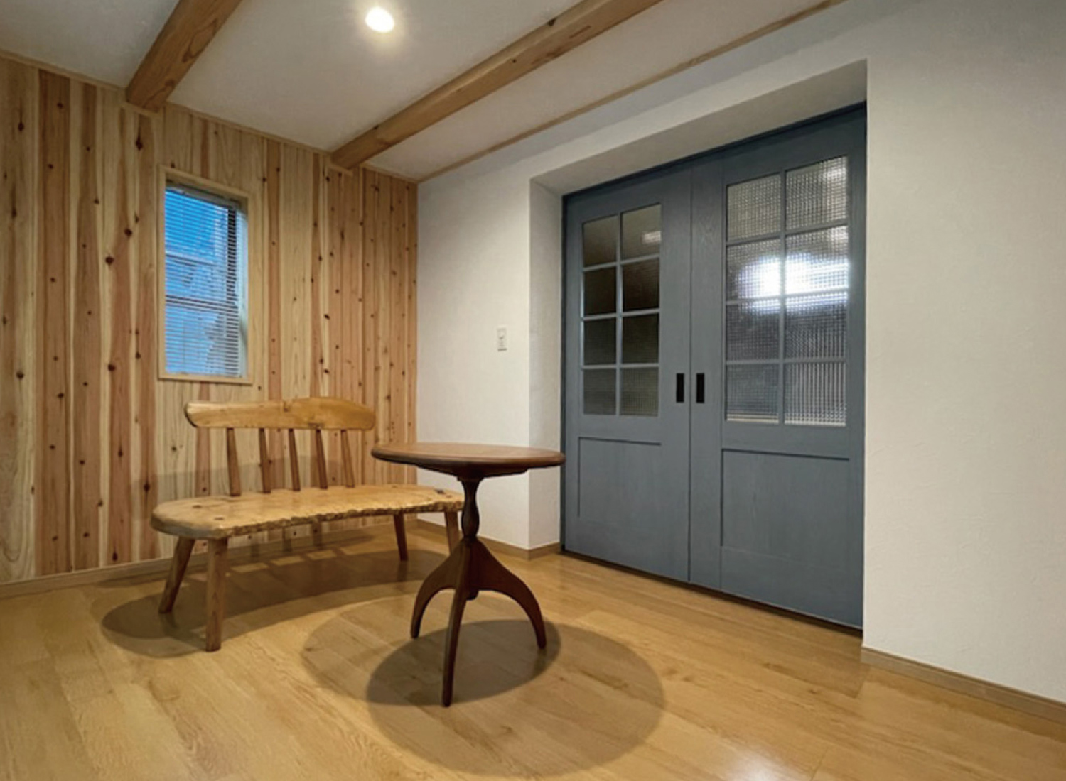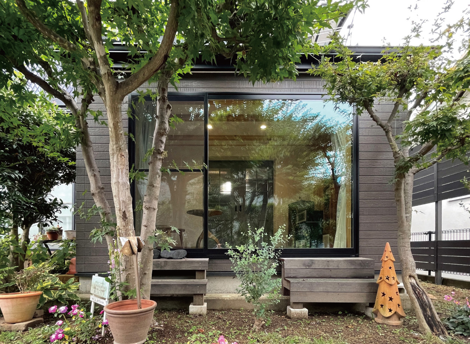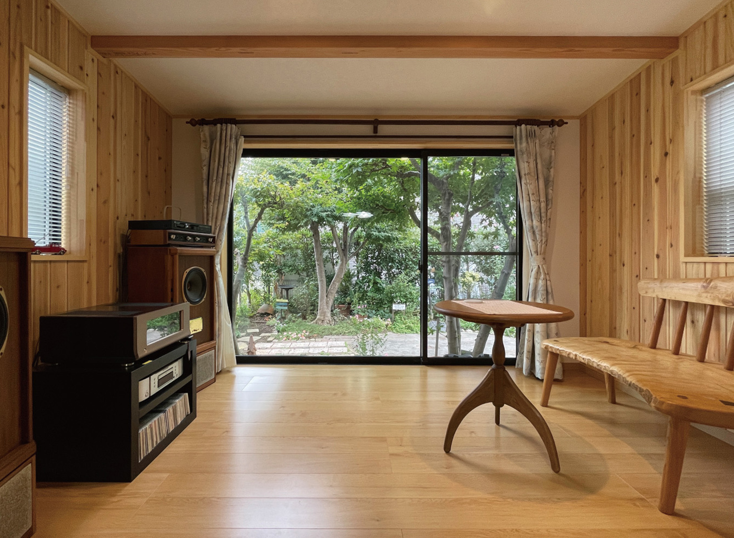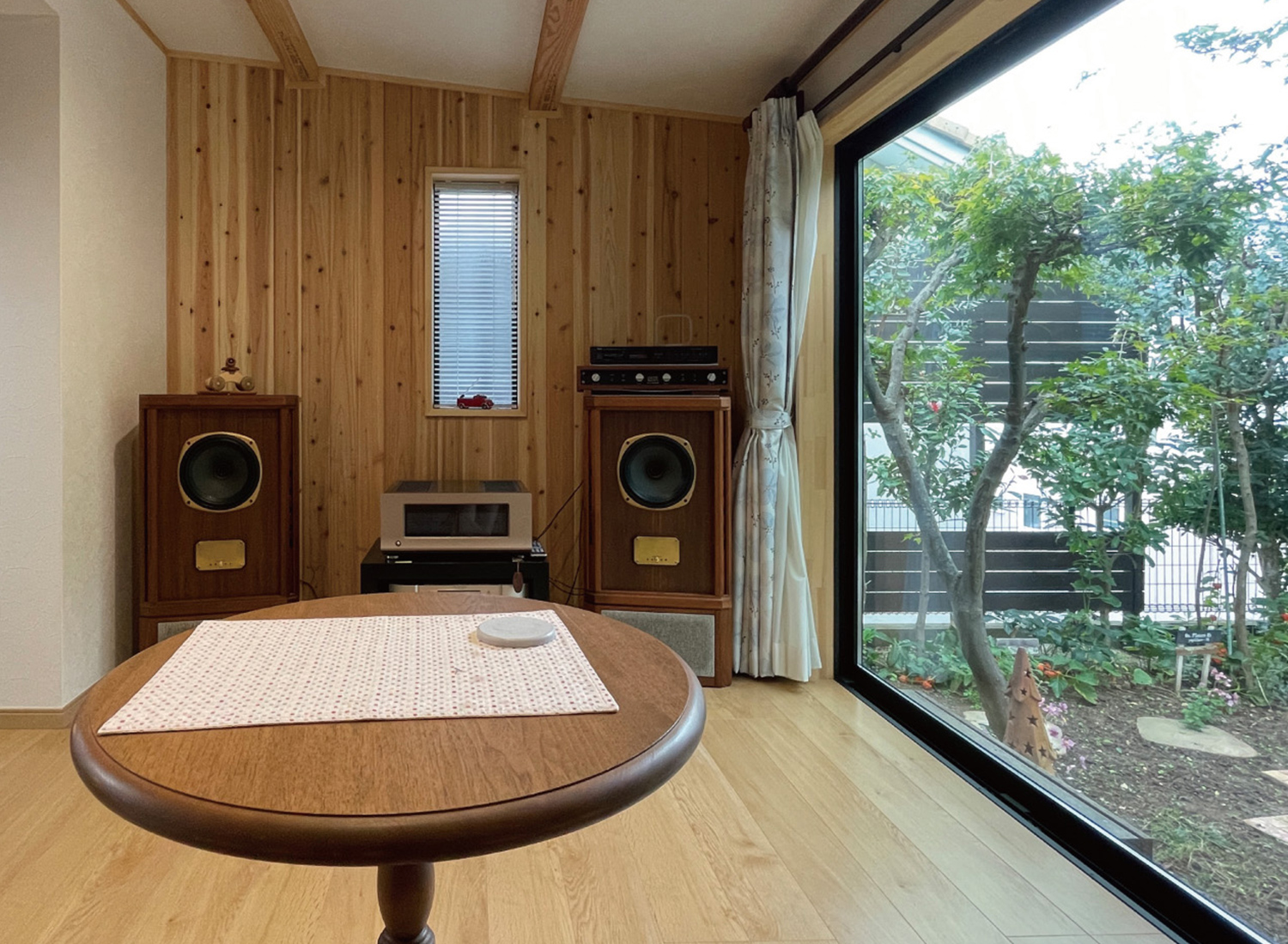 お子様の進学で、ご夫婦ふたりの生活になったT様。住まいも心機一転したいと外観を一新され、さらに庭に面したウッドデッキのあった場所に趣味の音楽鑑賞の部屋を新設。愛用のスピーカーから流れる音楽と庭の景色をゆったり楽しめる空間が完成しました。