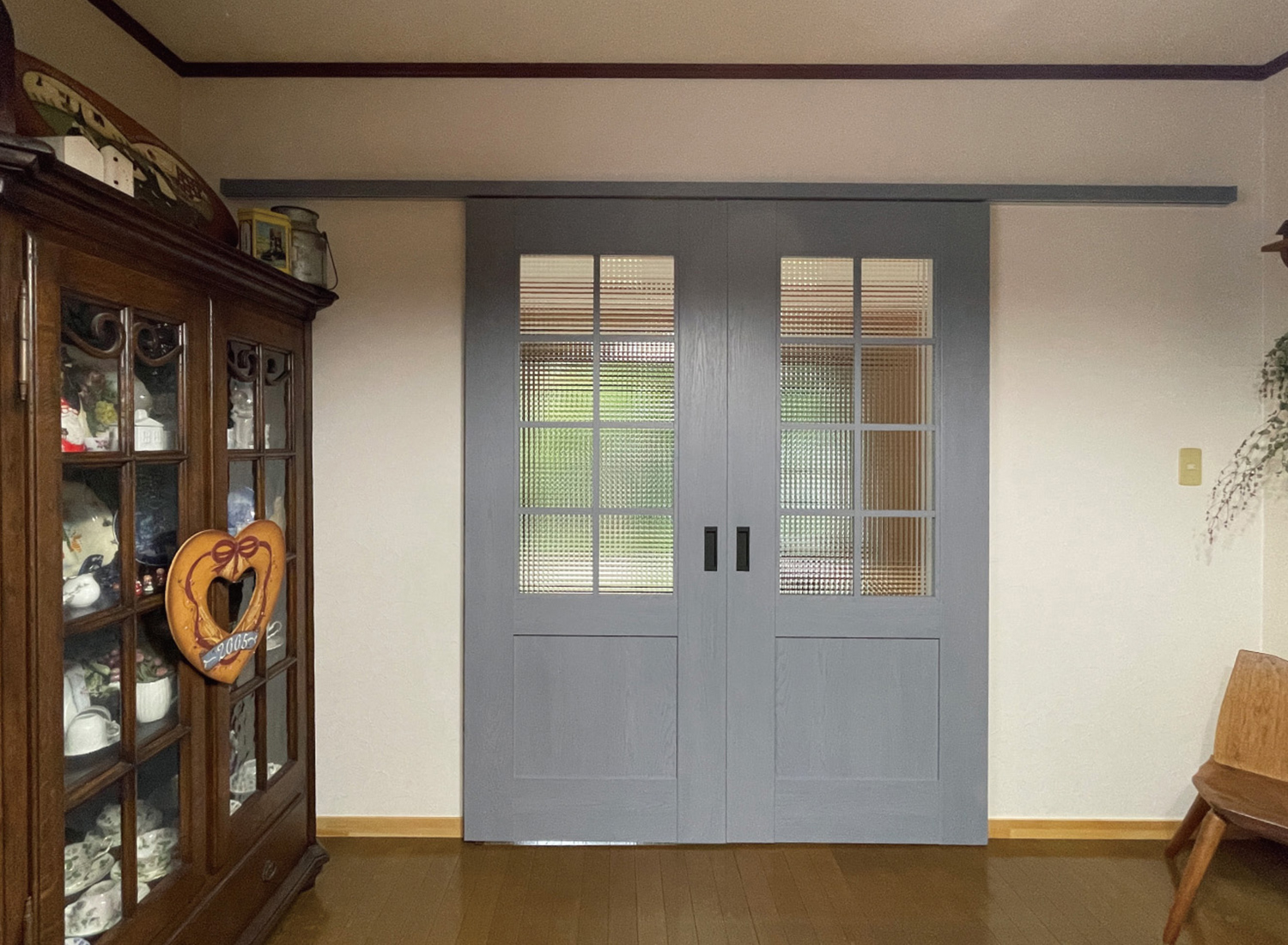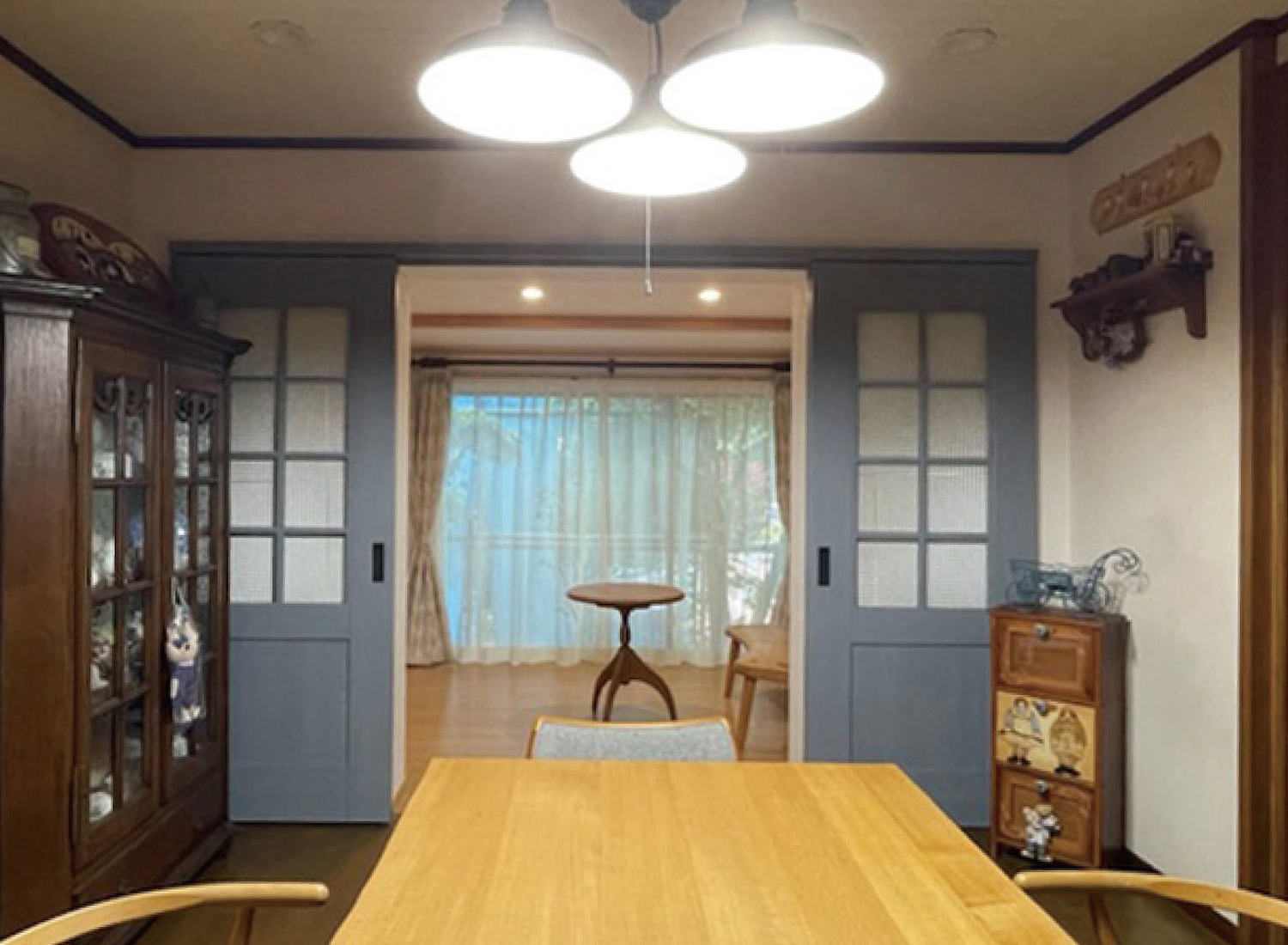 趣味室とLDKを隔てる引き戸はガラス採光タイプにして庭の存在を感じられます。