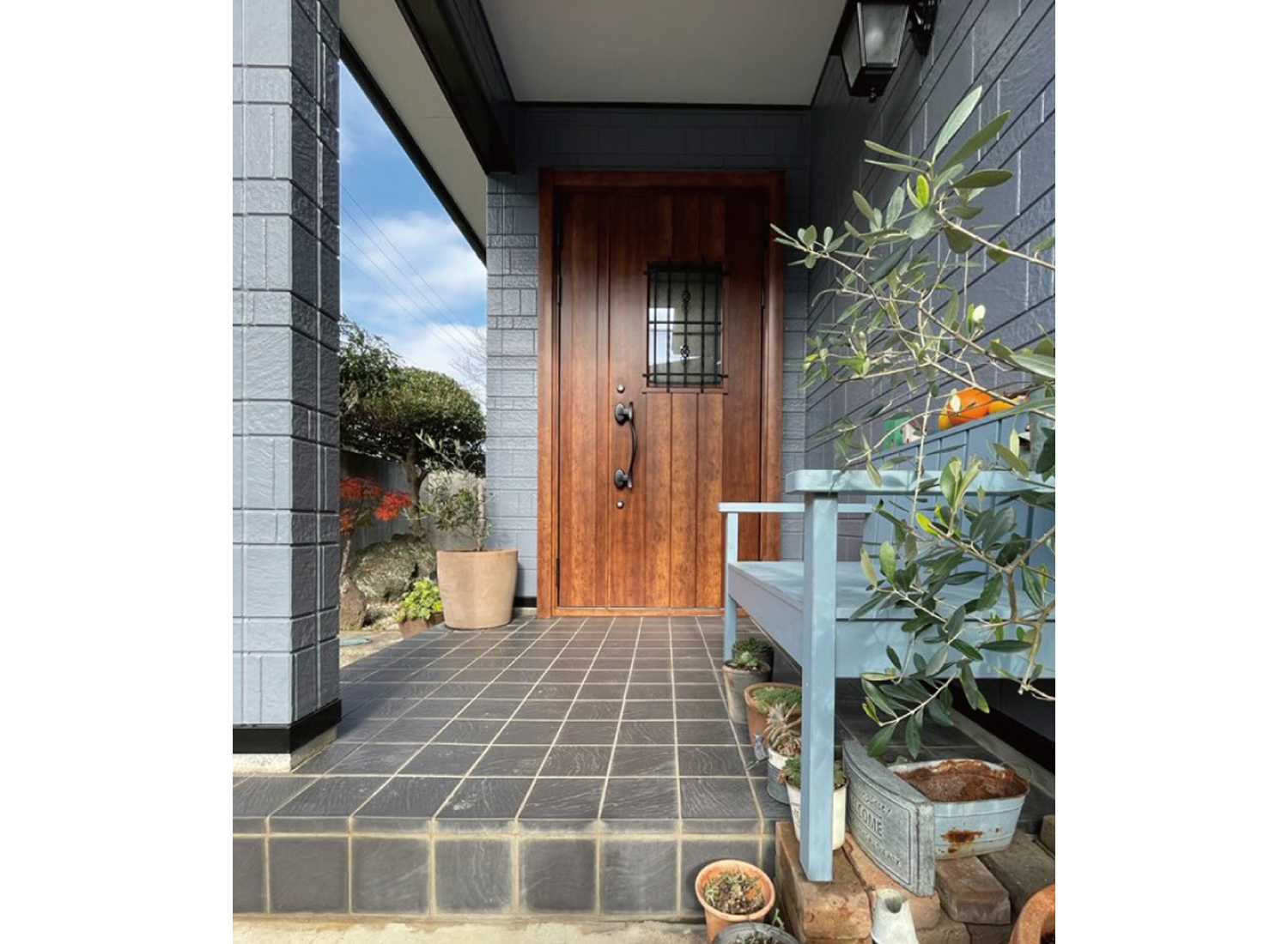 新しくなったブルーグレーの外観に、オシャレな玄関ドアがアクセントに。