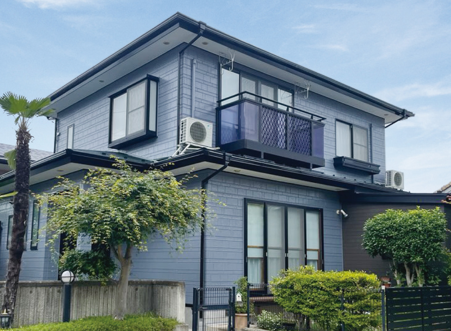外観は「やさしさ」と「上品さ」を感じられるブルーグレーを選択。庭木のグリーンが一層映えます。
