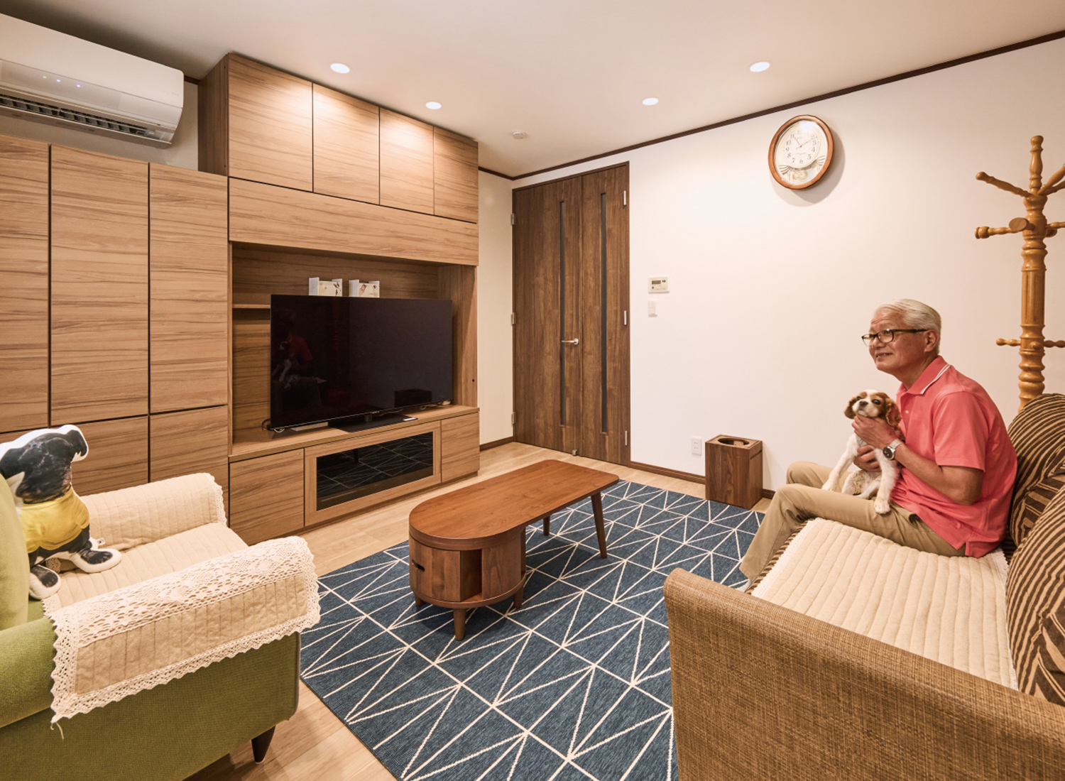親世帯のリビングは大容量の壁面収納を設置しました。エアコンやテレビなどもすっきり納まっています。