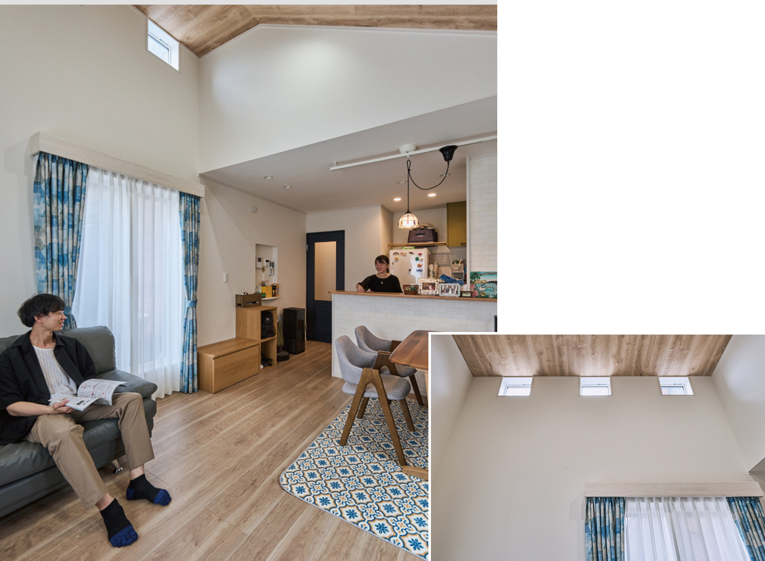 子世帯のLDKはオープンな対面キッチンと勾配天井で開放感を生み出しています。気持ちの良い自然光が降りそそぐ高窓も設けました。