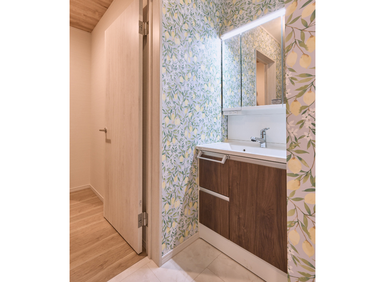 子世帯夫婦がふたりで選んだ、花柄のアクセント壁紙が印象的な洗面室。