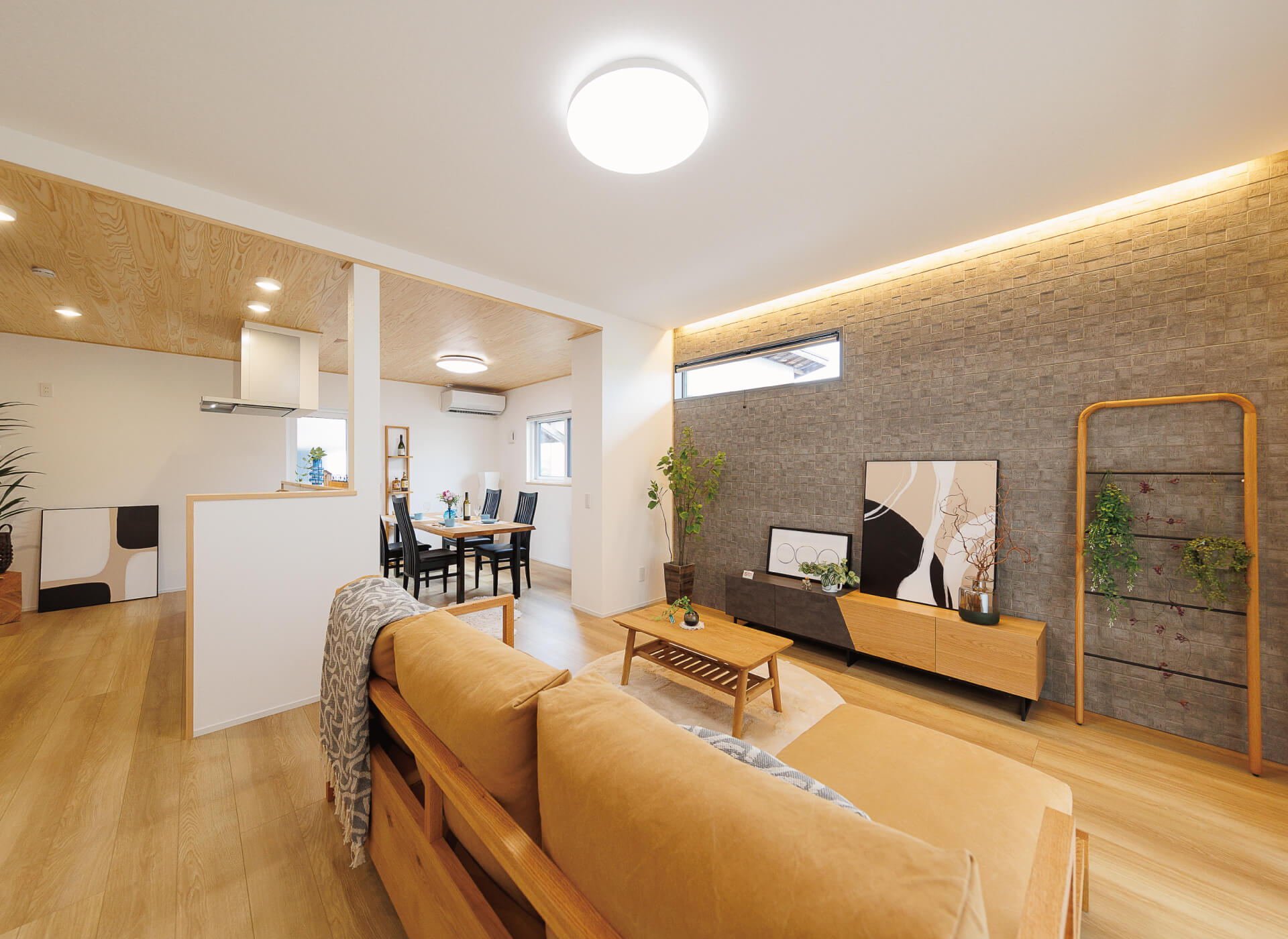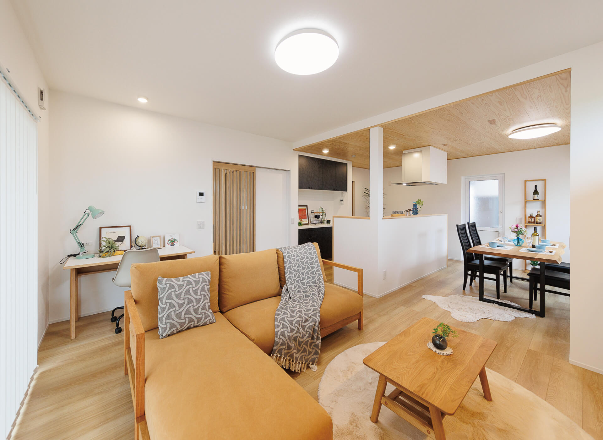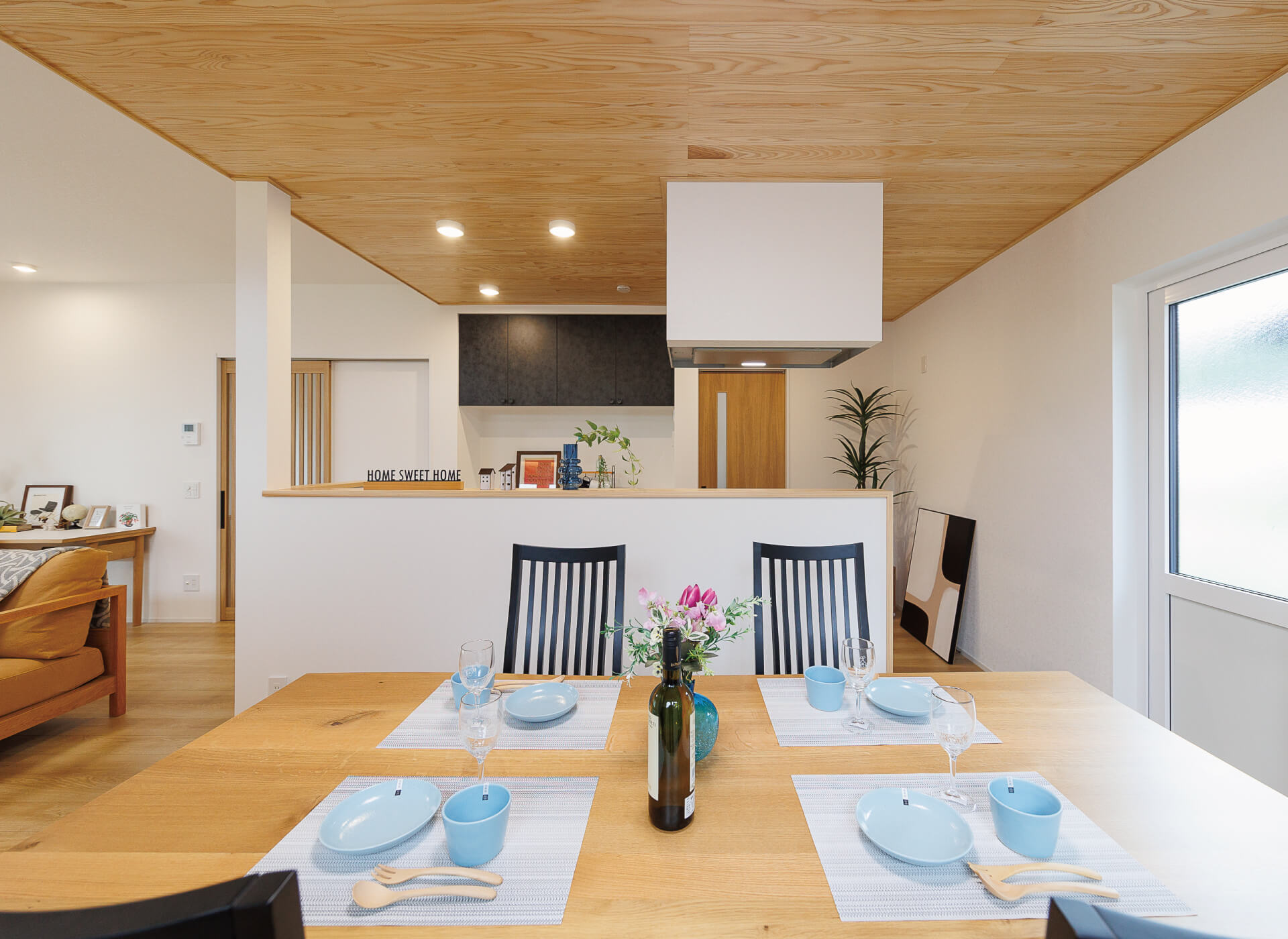 ダイニングキッチンの板張りの天井はリビング側と高さを変えて空間をゆるやかに仕切ります。白い空間のアクセントにカップボードはダークな色を選びました。
