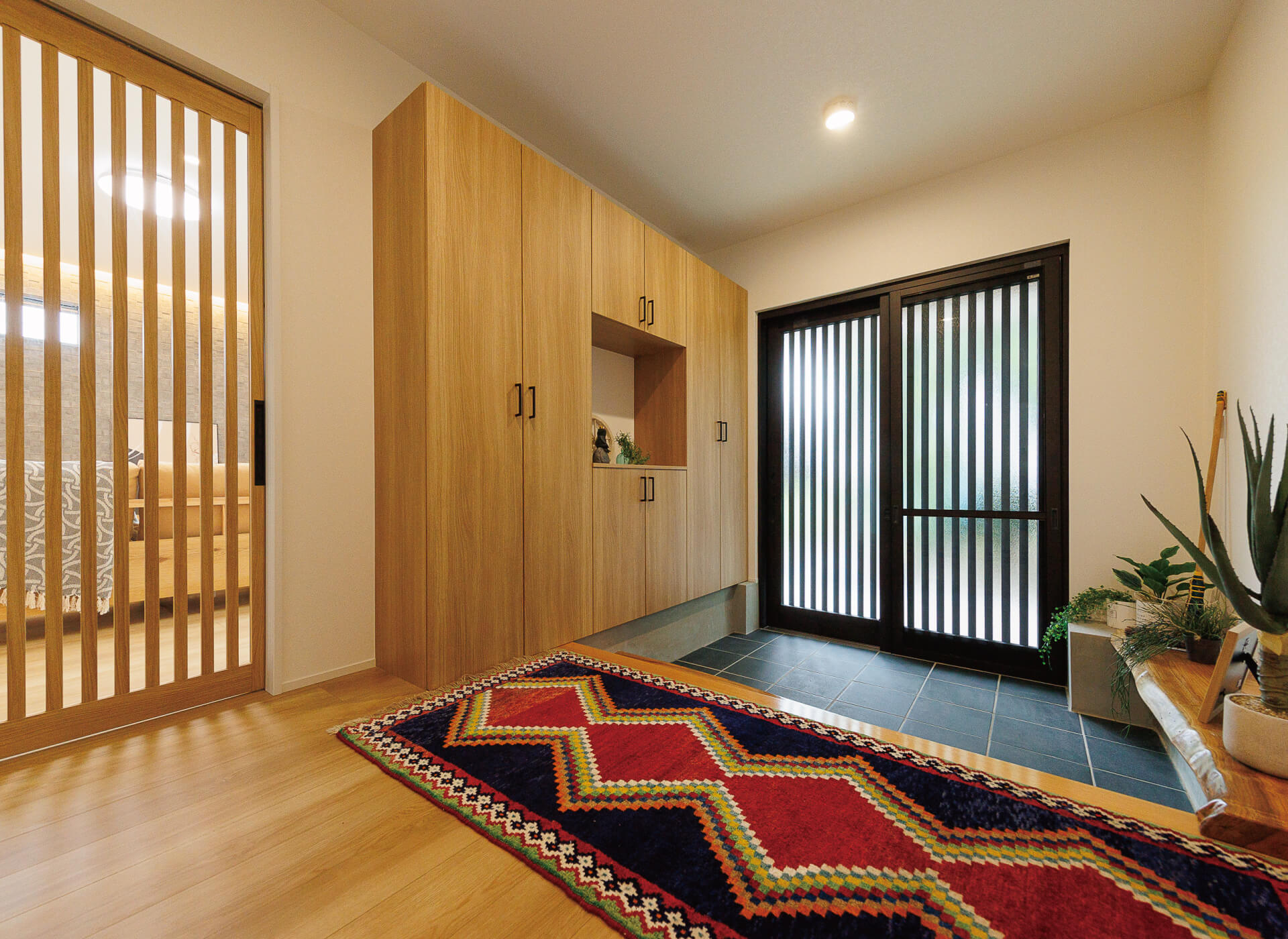 縦格子の玄関ドアとリビングにつながるドア、さらに欅の一枚板で作られた框と腰掛けが、上質な和の印象を与えています。