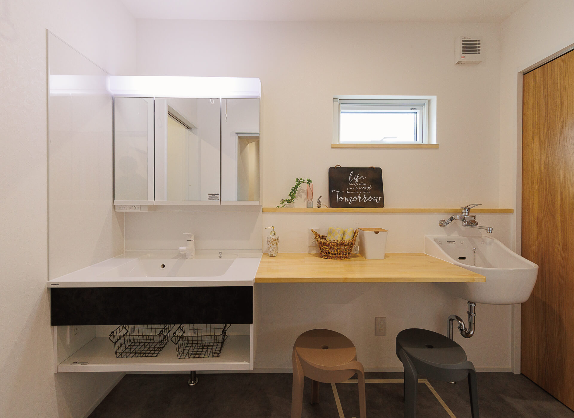 作業スペースとして洗面台の横に棚を造作した広々したサニタリー。朝の身支度の混雑を解消する役割もあります。