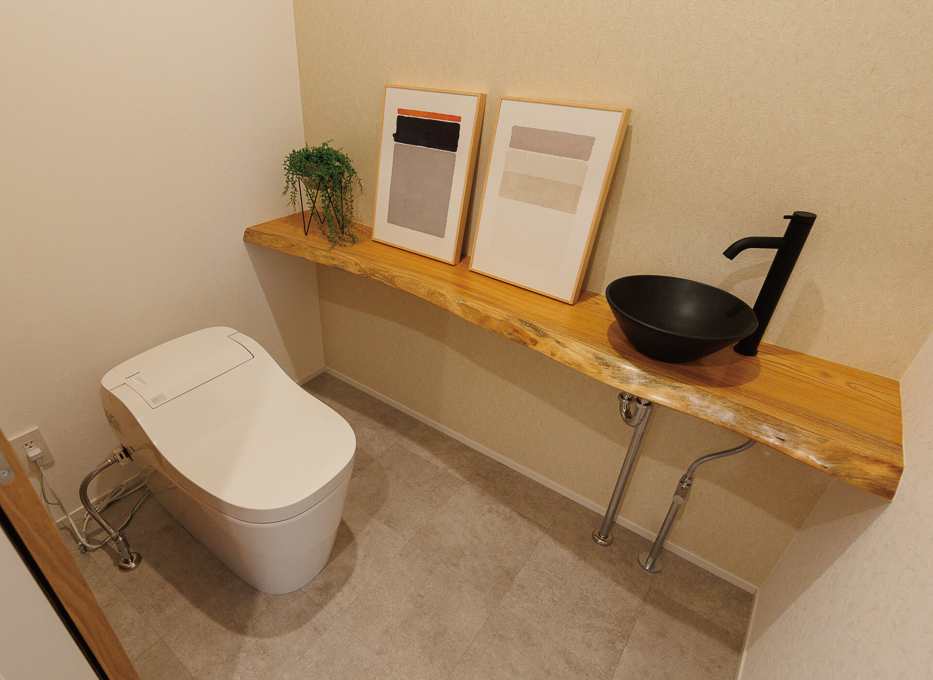 ブラックの洗面ボールと水栓が映える欅の一枚板を活用したカウンター。シンプルで落ち着いた空間に仕上げています。