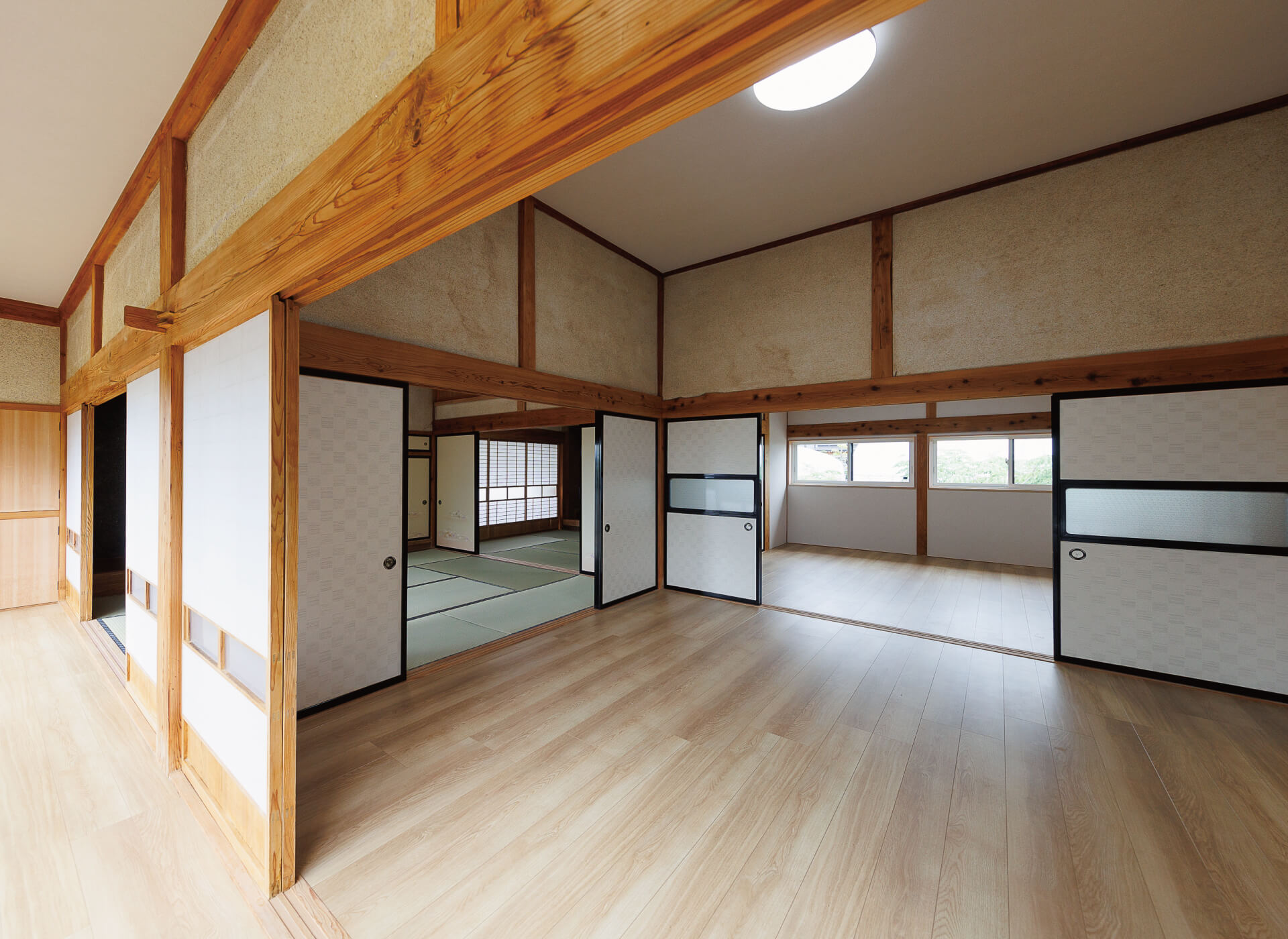 築40年の母屋部分はスケルトンリフォームで構造体から見直し、築70年の座敷部分は既存の建材や仕様をできるだけ残しながら現代の断熱性・気密性を確保した住まいを実現しました。