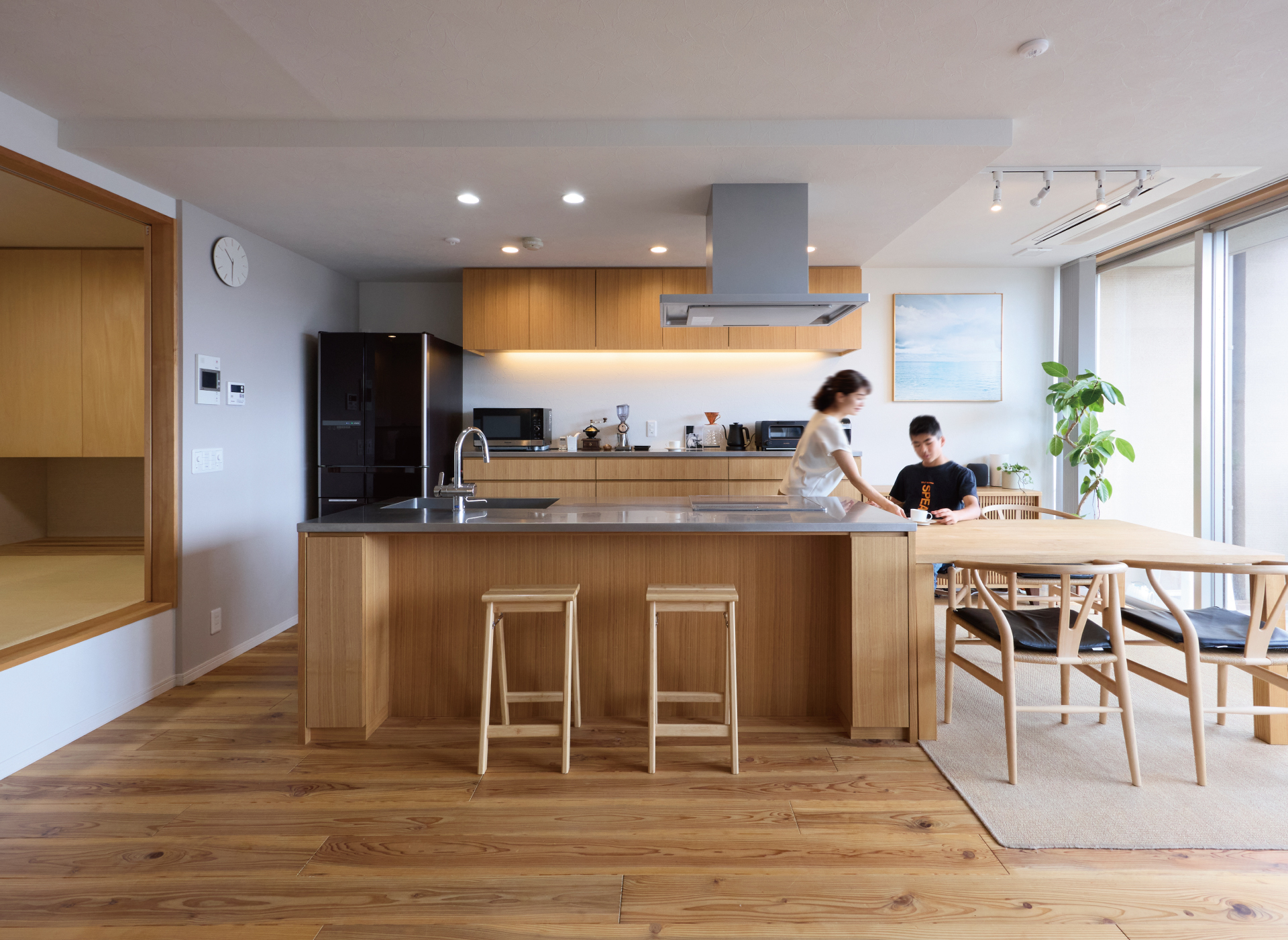メゾネットタイプのマンションを屋久島地杉の香りにあふれる住まいにリノベーション。1階は部活からの帰宅時に砂や泥を室内に持ち込まないよう玄関収納と洗面・ランドリー・浴室を配置。2階は癒しのLDKを実現しました。