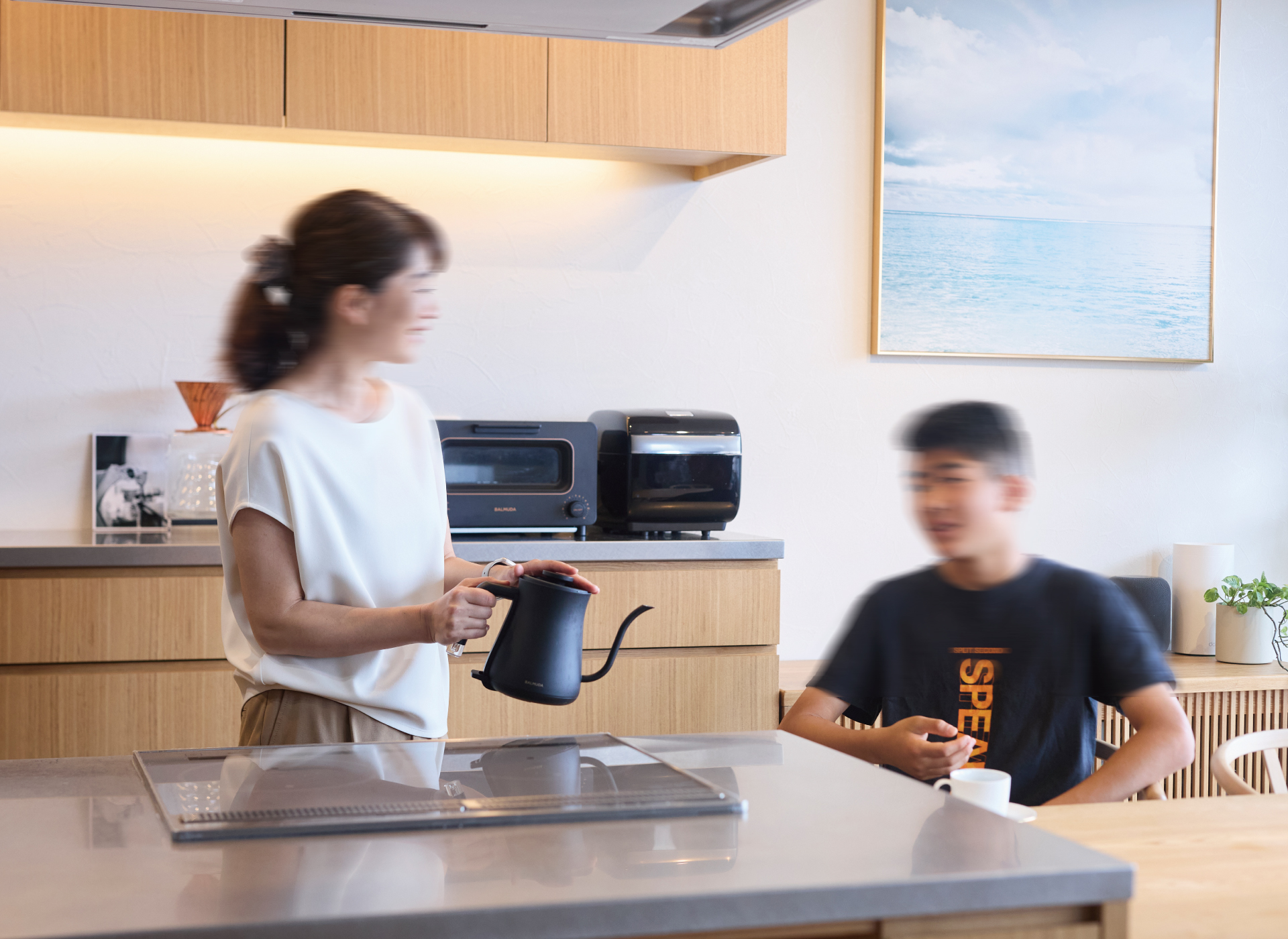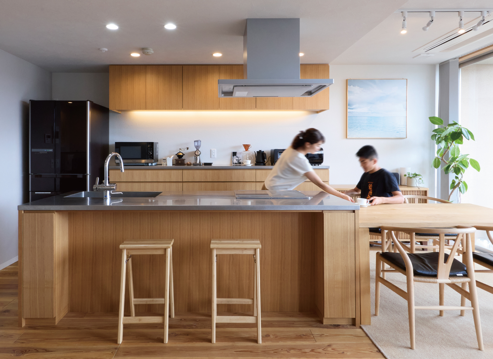 半個室だったキッチンをオープンなアイランド型にしたことで、快適に料理ができるようになりました。キッチンとダイニングテーブルを横並びにしたことで配膳や後片付けもラクになり、子どもたちも手伝ってくれるようになりました。