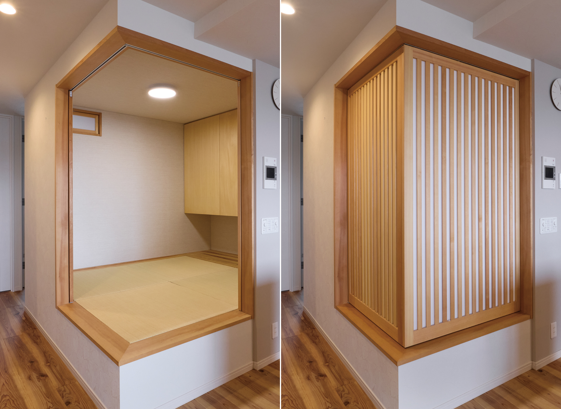 リビングの一角に、引き戸で仕切れる畳スペースを設けました。畳の下は、大きなものもしまえる大容量の収納として活躍。