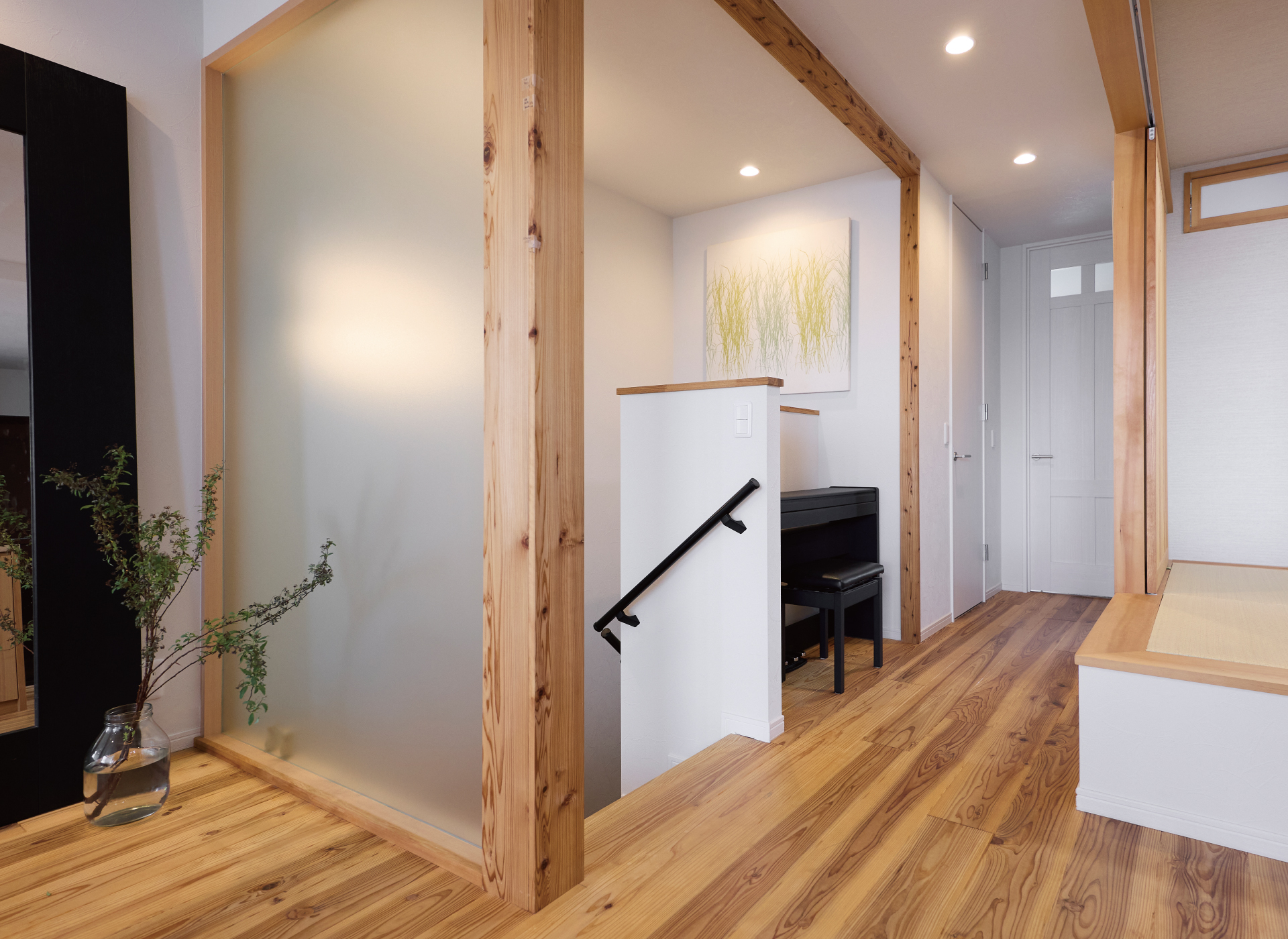 趣味のピアノを廊下に面して配置。階段とリビングの間に、採光タイプの間仕切り壁を設けました。