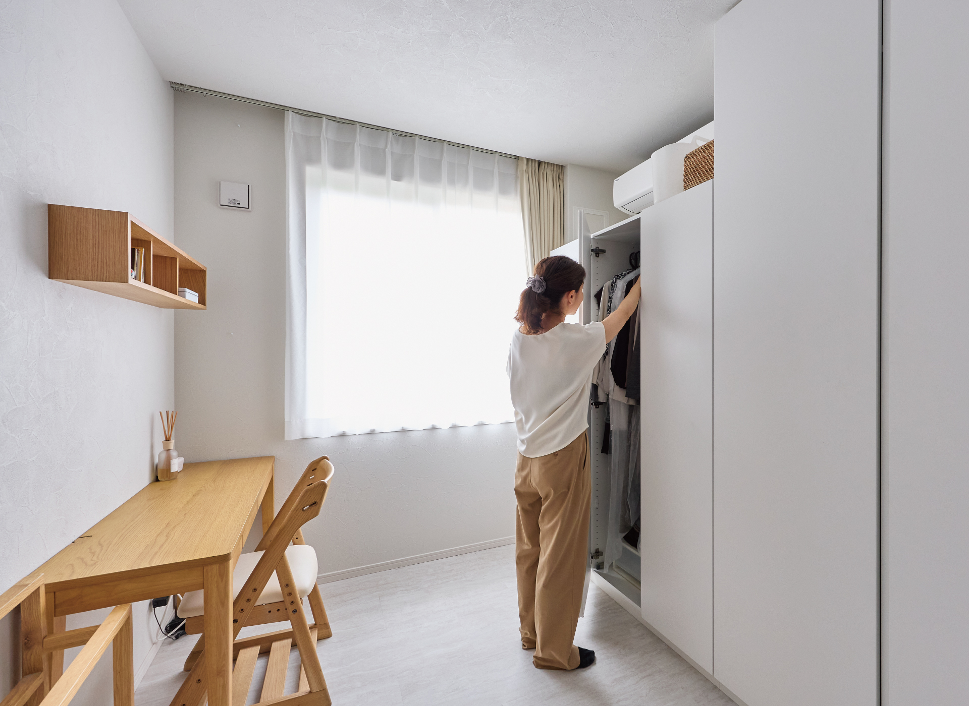 新設した大容量の収納は、家族それぞれのスペースを決めて使われています。天井高まであるハイドアが、空間をすっきりみせます。