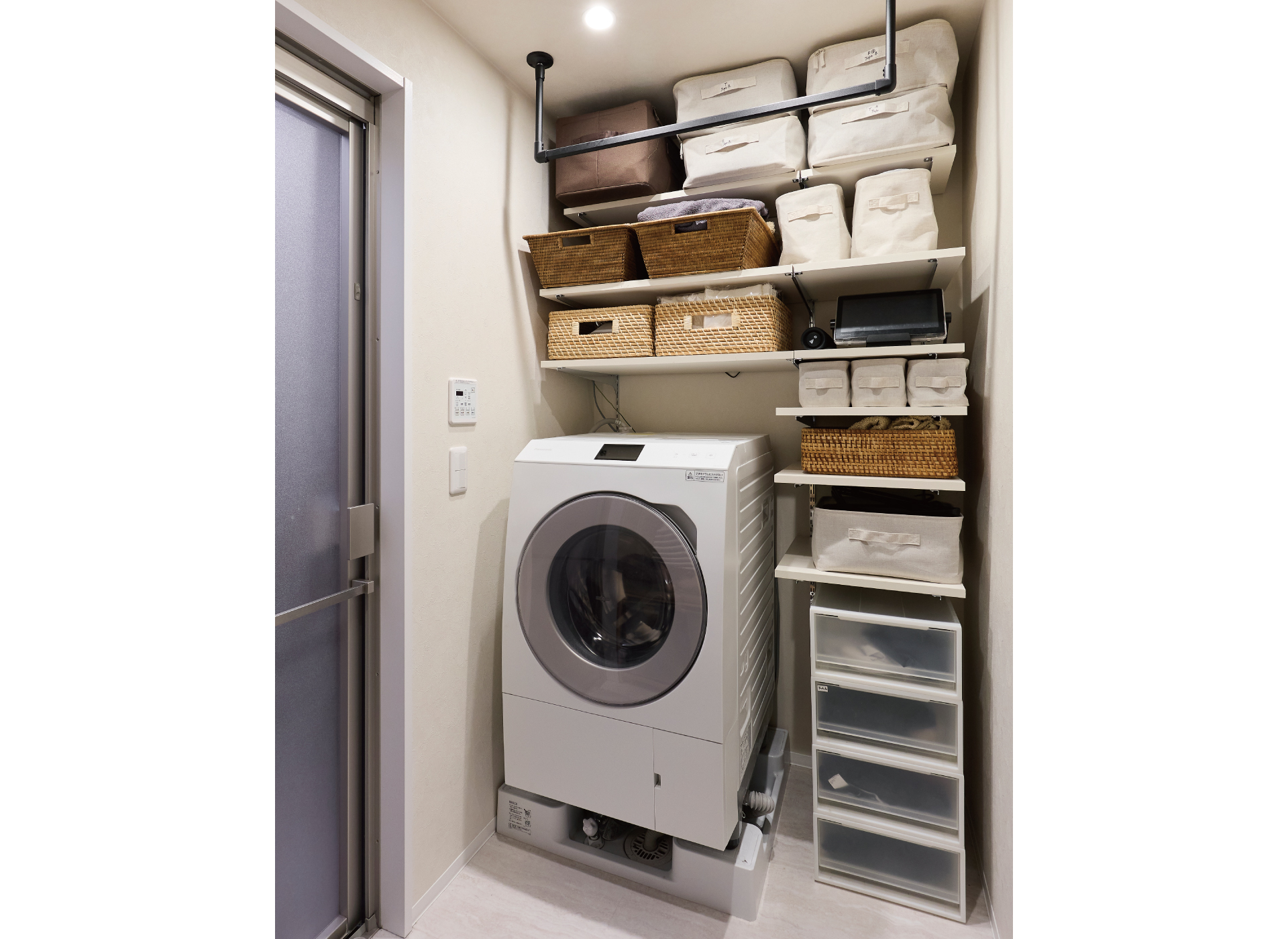 拡張した脱衣室の一部をランドリースペースに。洗濯物を仮干しできるアイアンバー、洗剤などを収納する棚を設置し、洗濯をラクに。