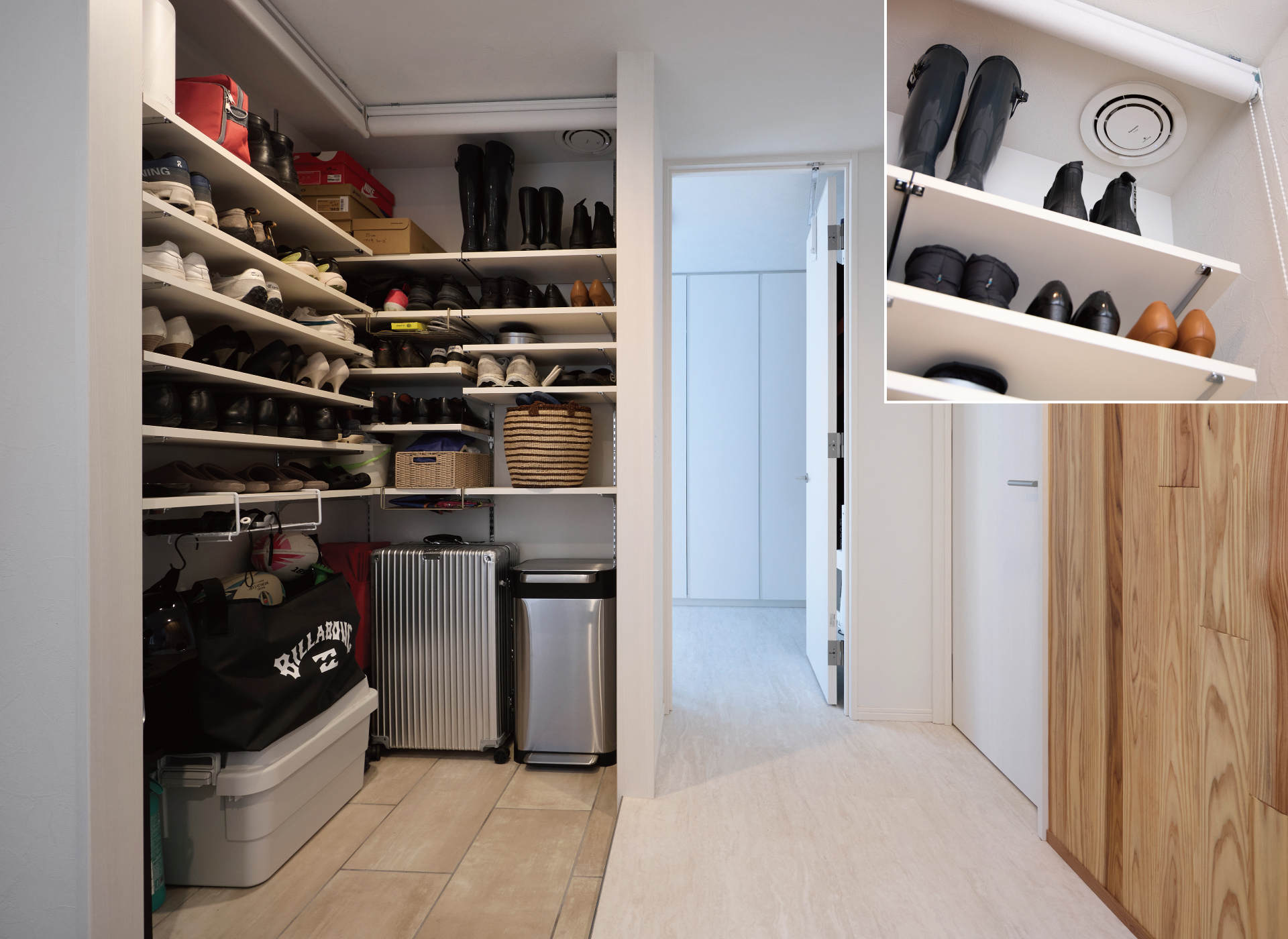 玄関土間から続くシューズクロークは、L型にオープン棚を設置して収納力を確保。天井埋込の「エアイー」が発生するナノイーXが、靴の気になるニオイを抑えます。