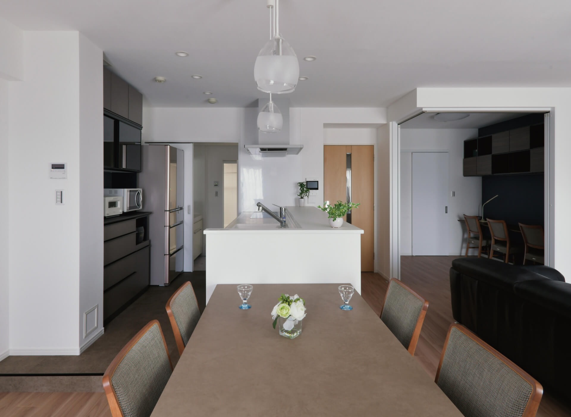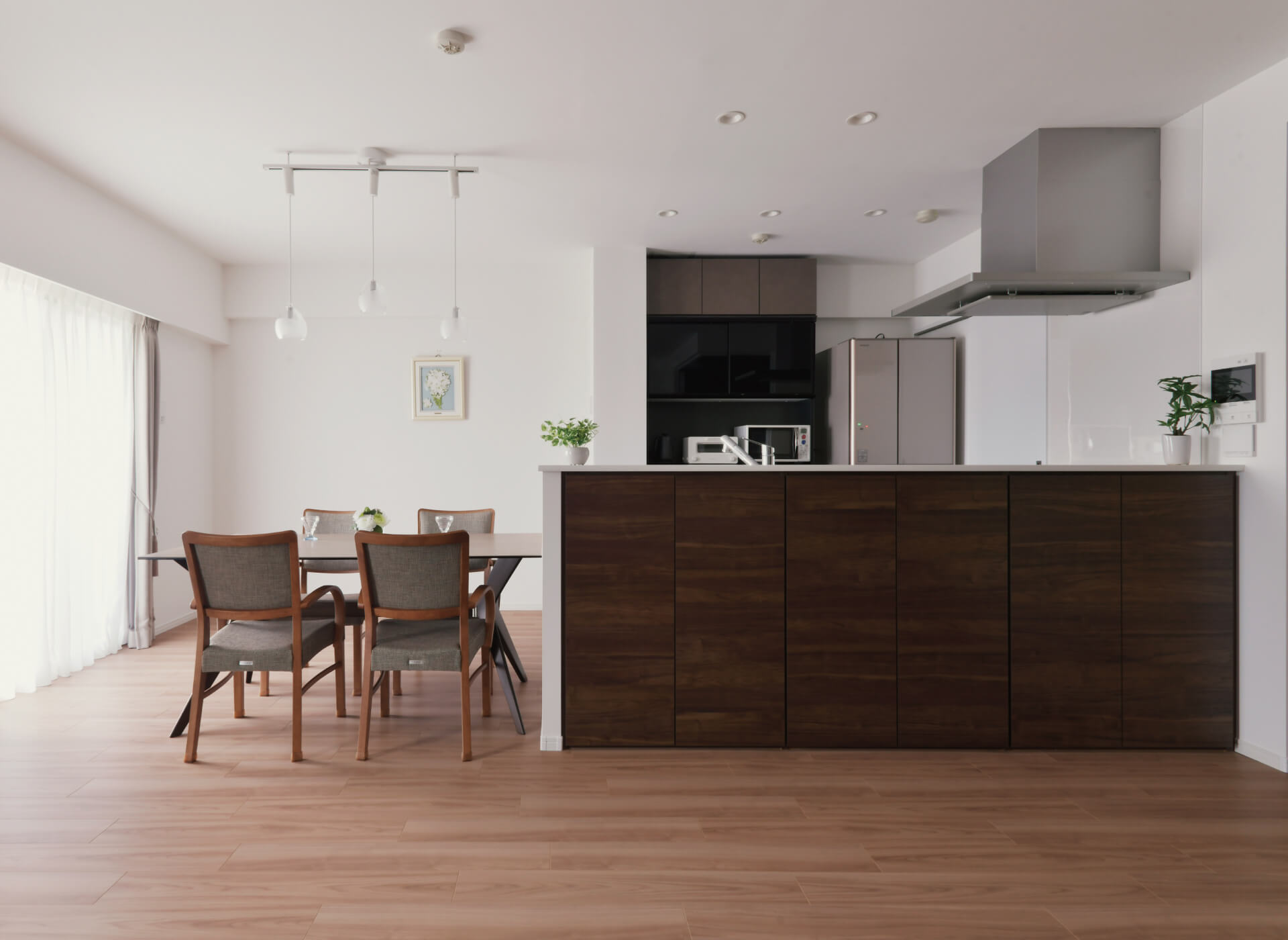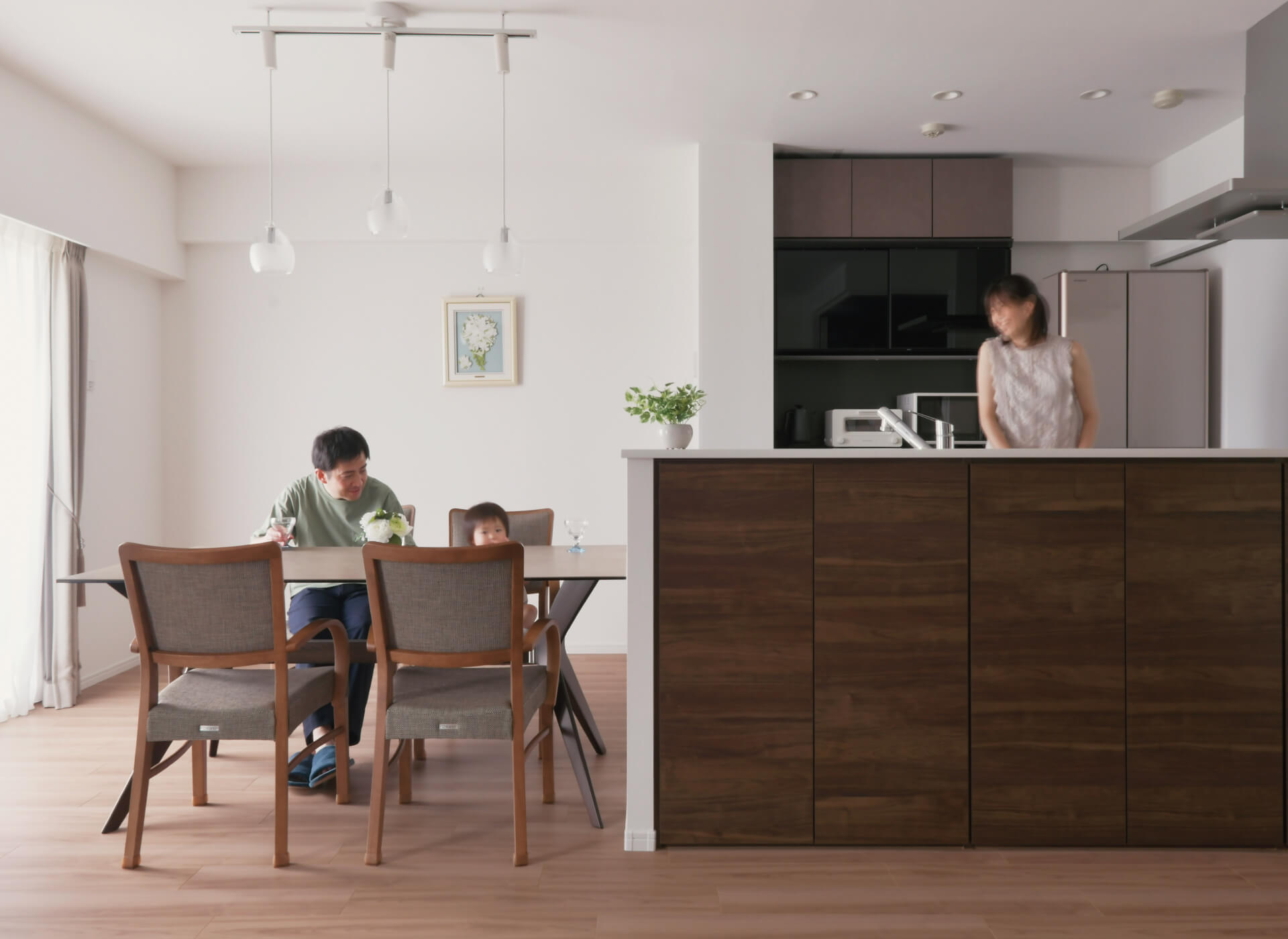 育児休暇明けの暮らしを見据え、中古マンションを購入しリノベーションされたM様。ゆったりした洗面室やベビーカーを置ける広い玄関、ワークスペース、そして念願の対面キッチンを実現。仕事も家族の時間も充実させる住まいが実現しました。