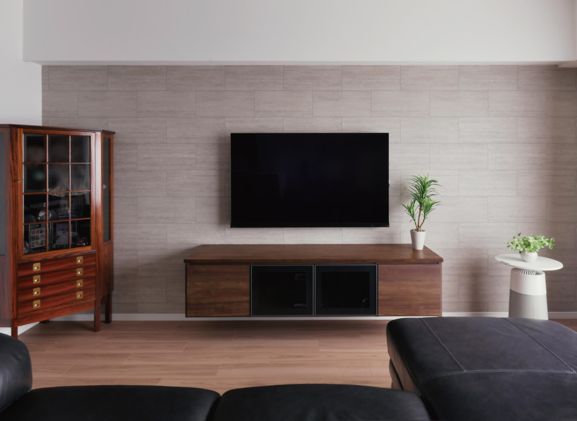 テレビは壁付けに、テレビボードもフロートタイプを選びました。配線類を壁内を通したので、アクセントクロスがより美しく映えます。