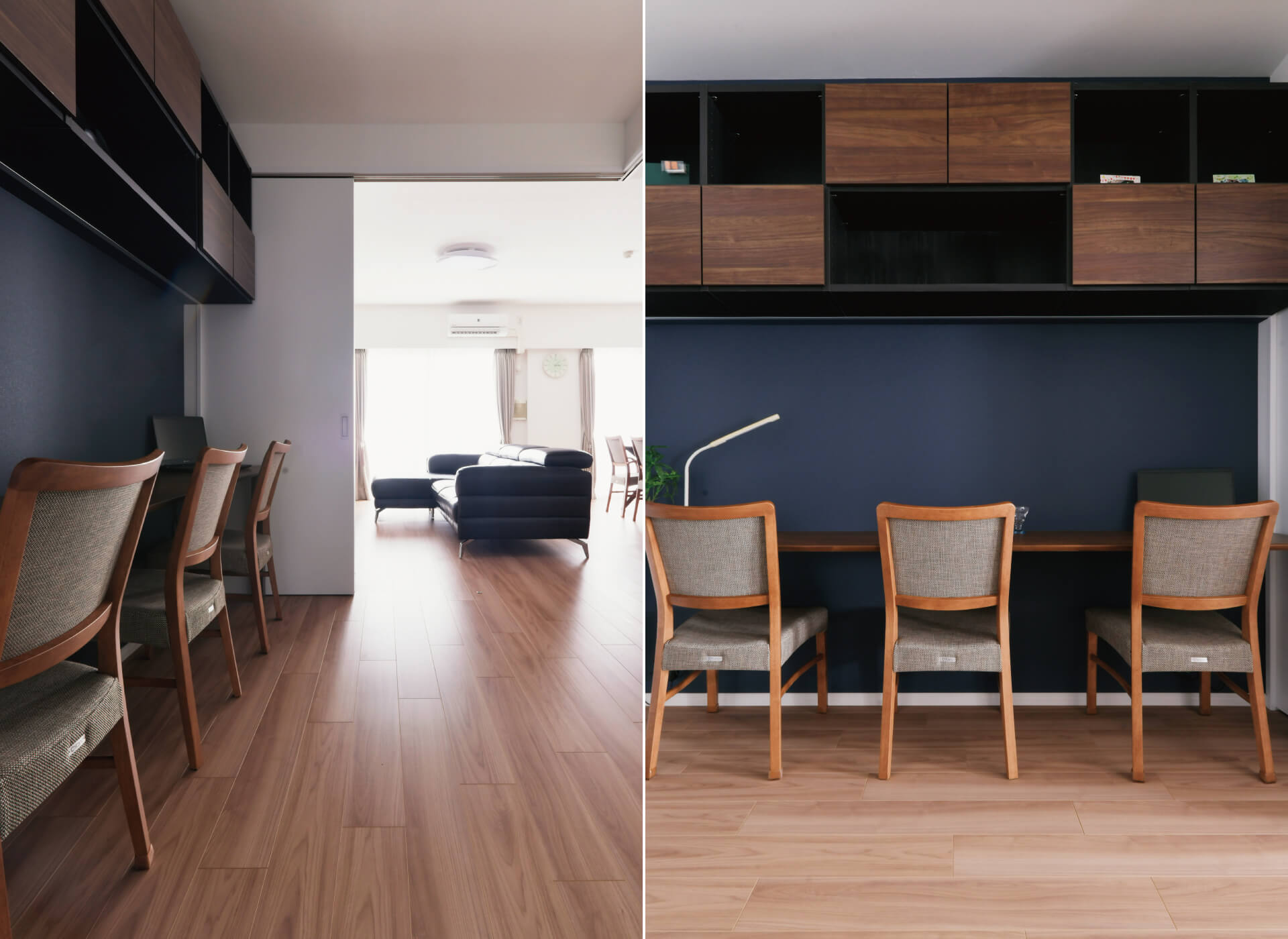 和室を改装してLDKの一角に設けたワークスペースは、将来お子様も一緒に並んで使えるよう3人用に。静かな環境で集中したいときは、扉を閉めて。