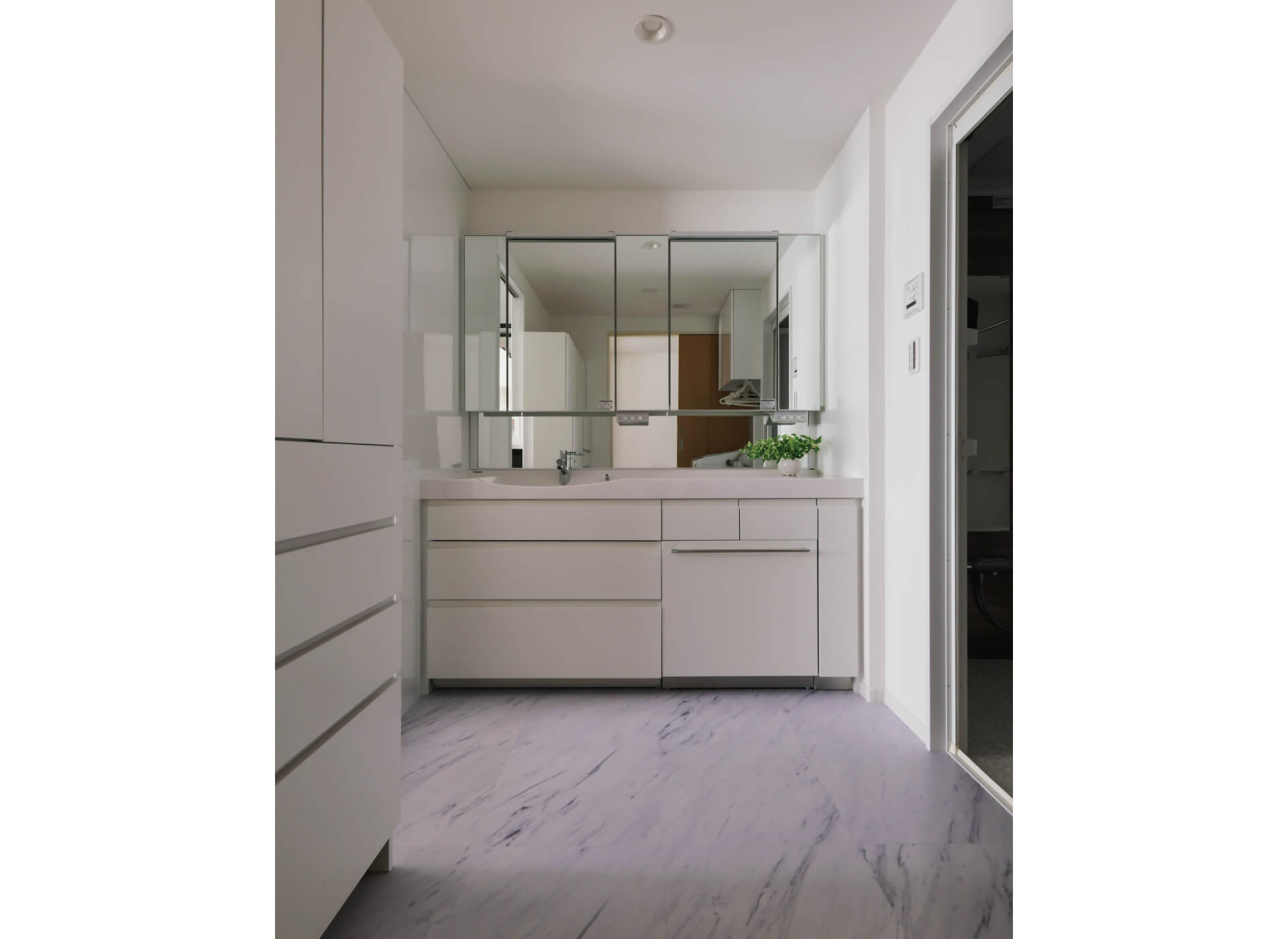 大きめの洗面台には引き出し式の椅子がついています。浴室をコンパクトにして洗面空間を広げたことで、1日の終わりをゆったり過ごせる場所になりました。