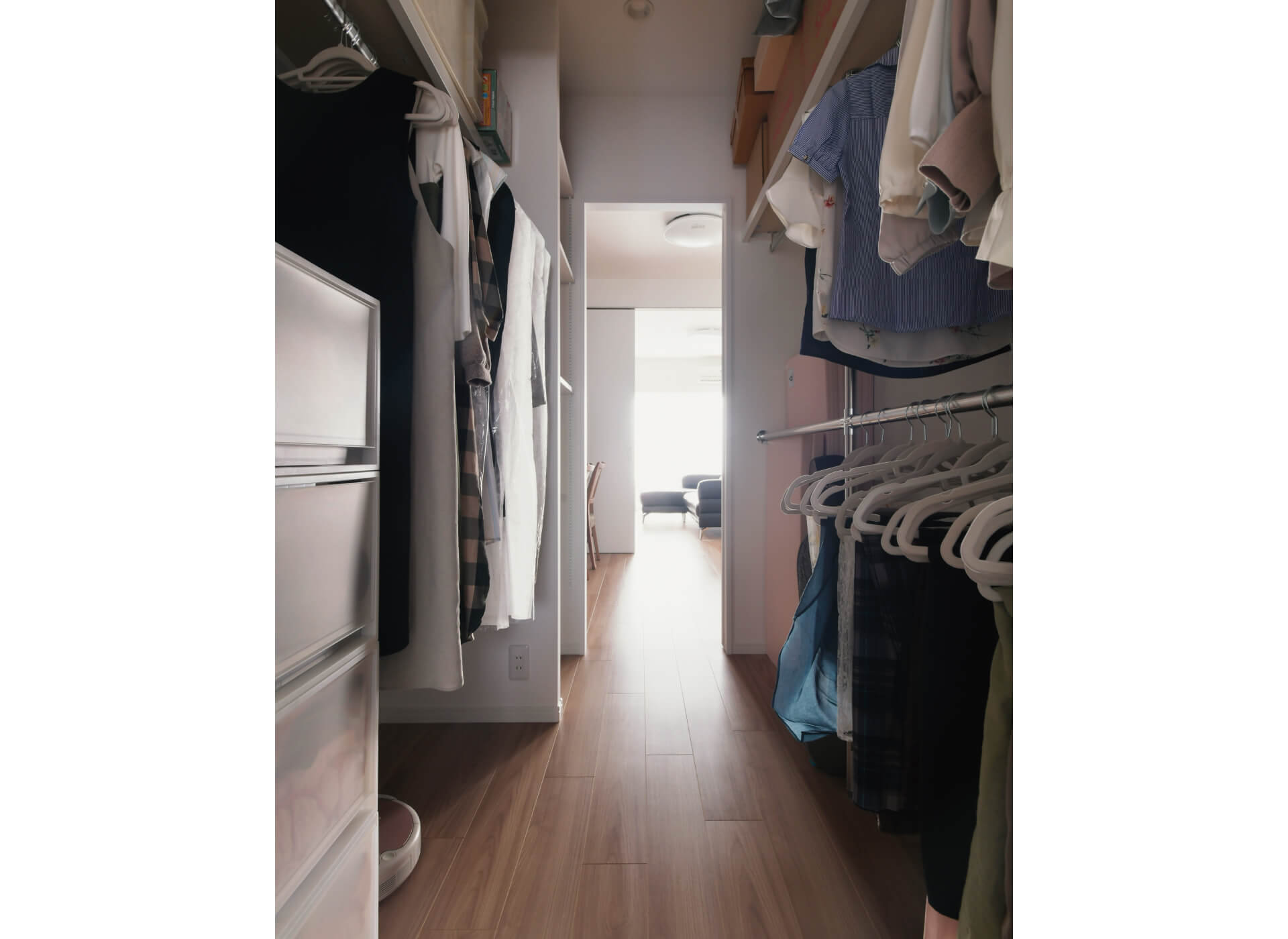 リビングに隣接するウォークスルークローゼット。動線が便利なだけでなく、風通しをよくする役割も担っています。