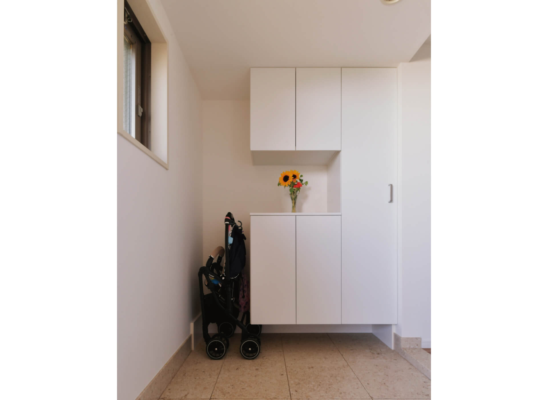 圧迫感のあった玄関収納は、お気に入りの小物が飾れるフロートタイプに。ベビーカー置き場も設け、機能性と洗練された印象を両立。