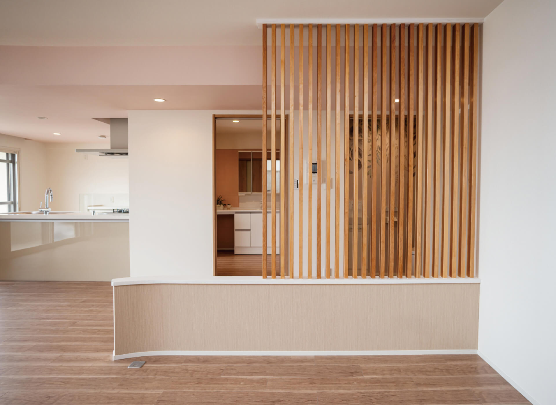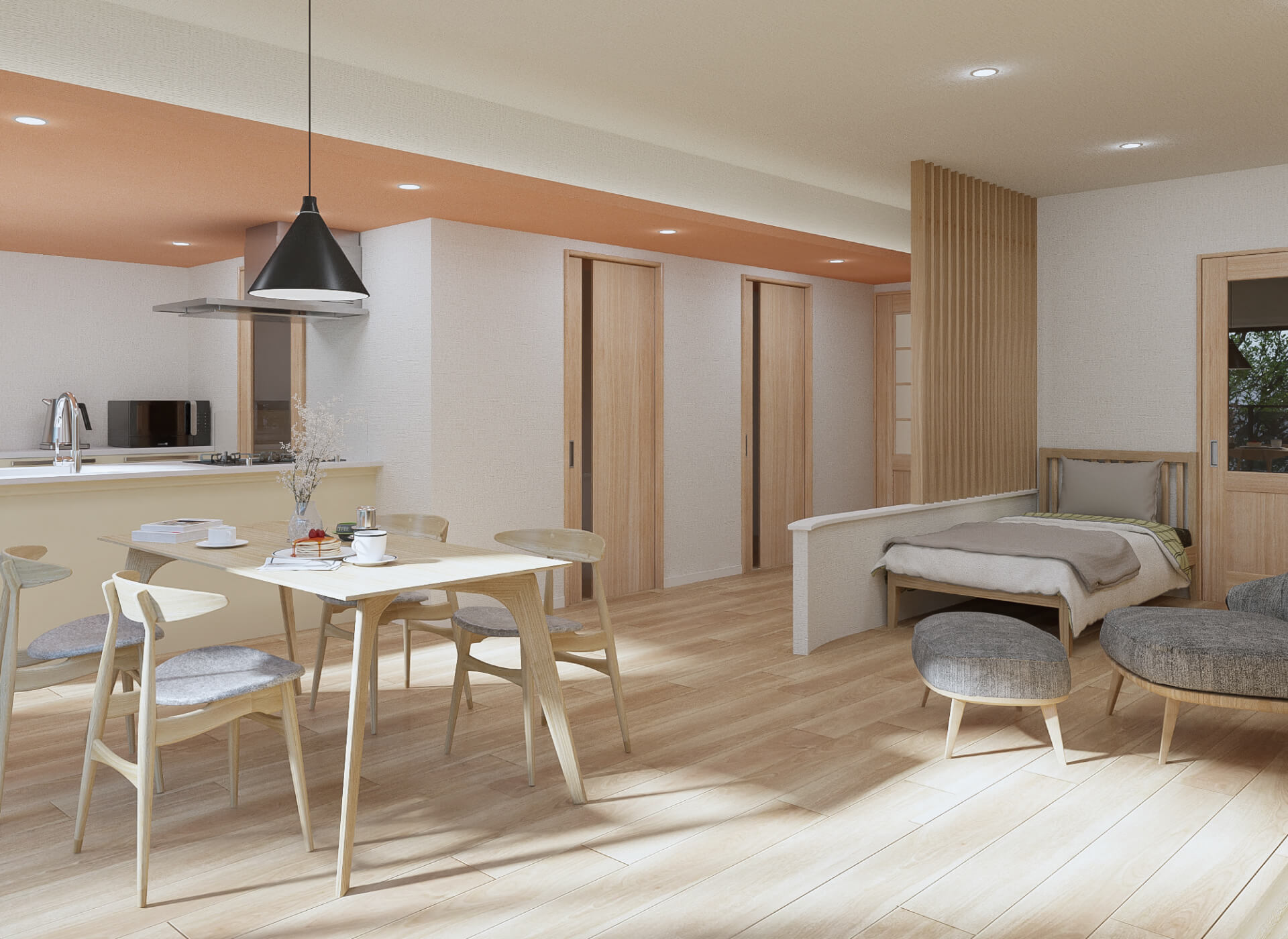 格子を取り入れ、空間に圧迫感を与えずに視線をコントロール。ベッドから通路や水廻りが直接見えないよう工夫しました。