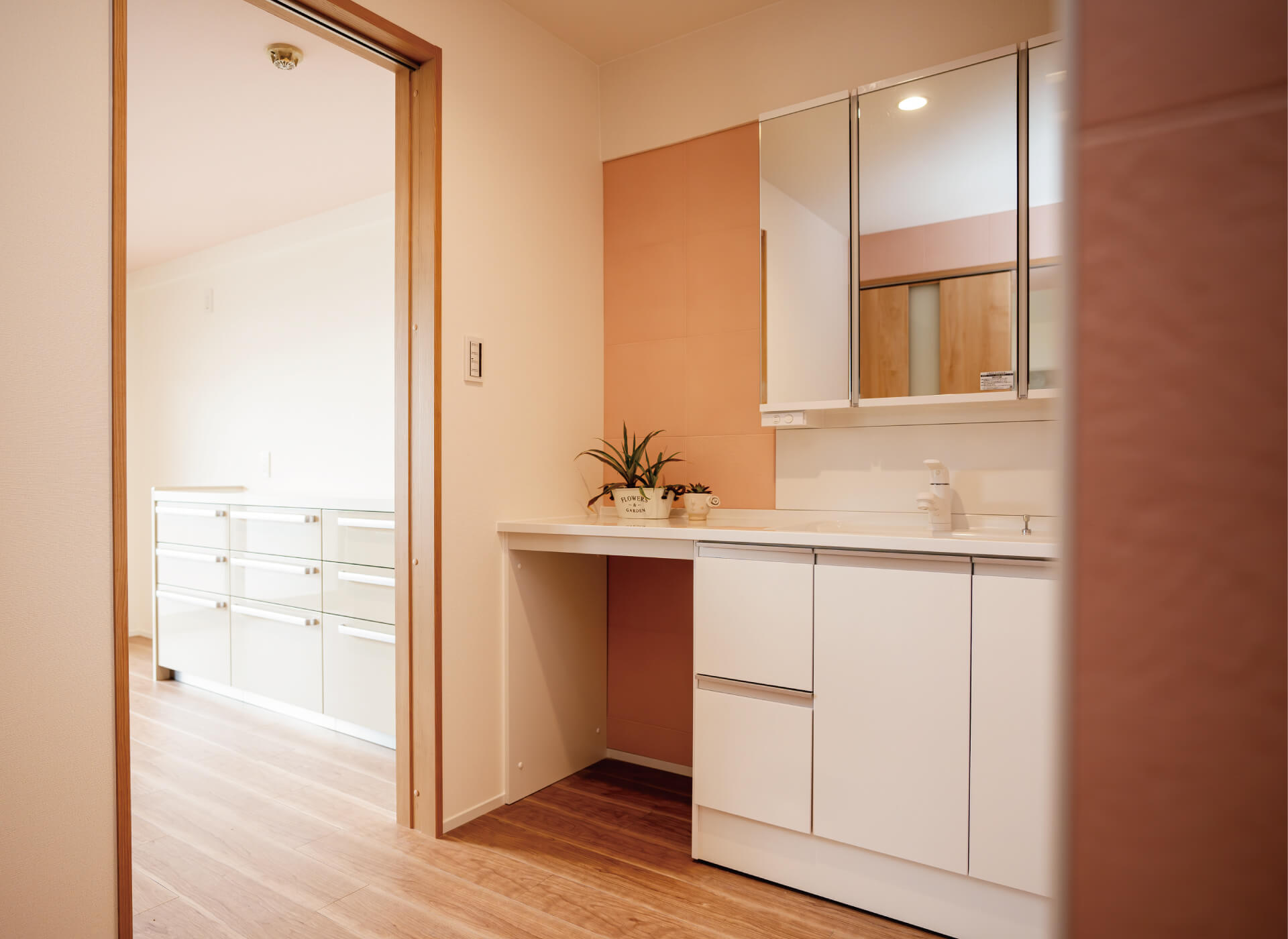 洗面脱衣所は出入り口を2ヵ所設け、廊下からキッチンを通って回遊できる間取りに。採光ガラスの扉で明るさも確保しています。