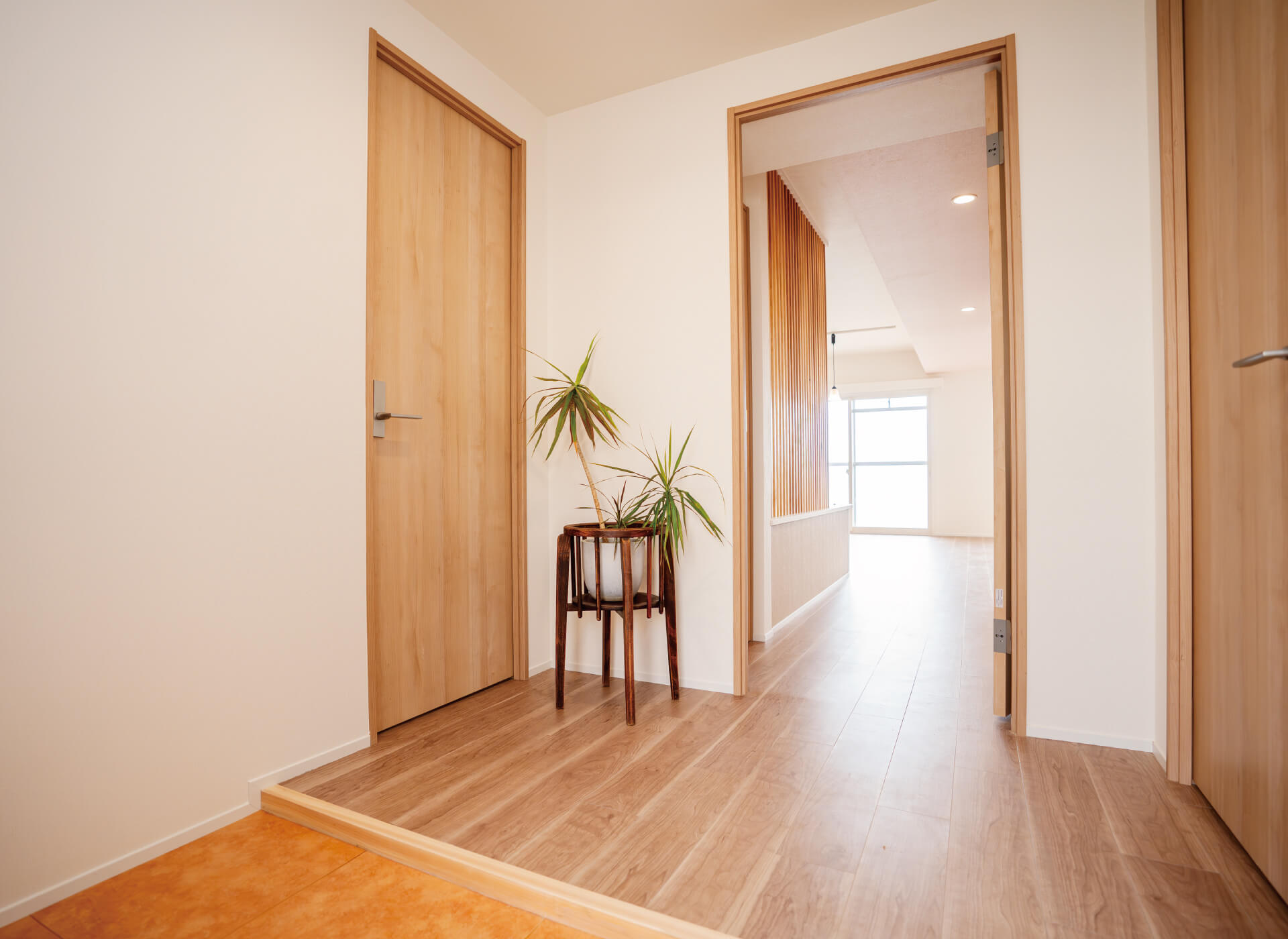間口を広げた、ゆとりのある玄関ホール。左の扉からウォークインクローゼット、ベッドコーナーへとつながる回遊動線を取り入れました。