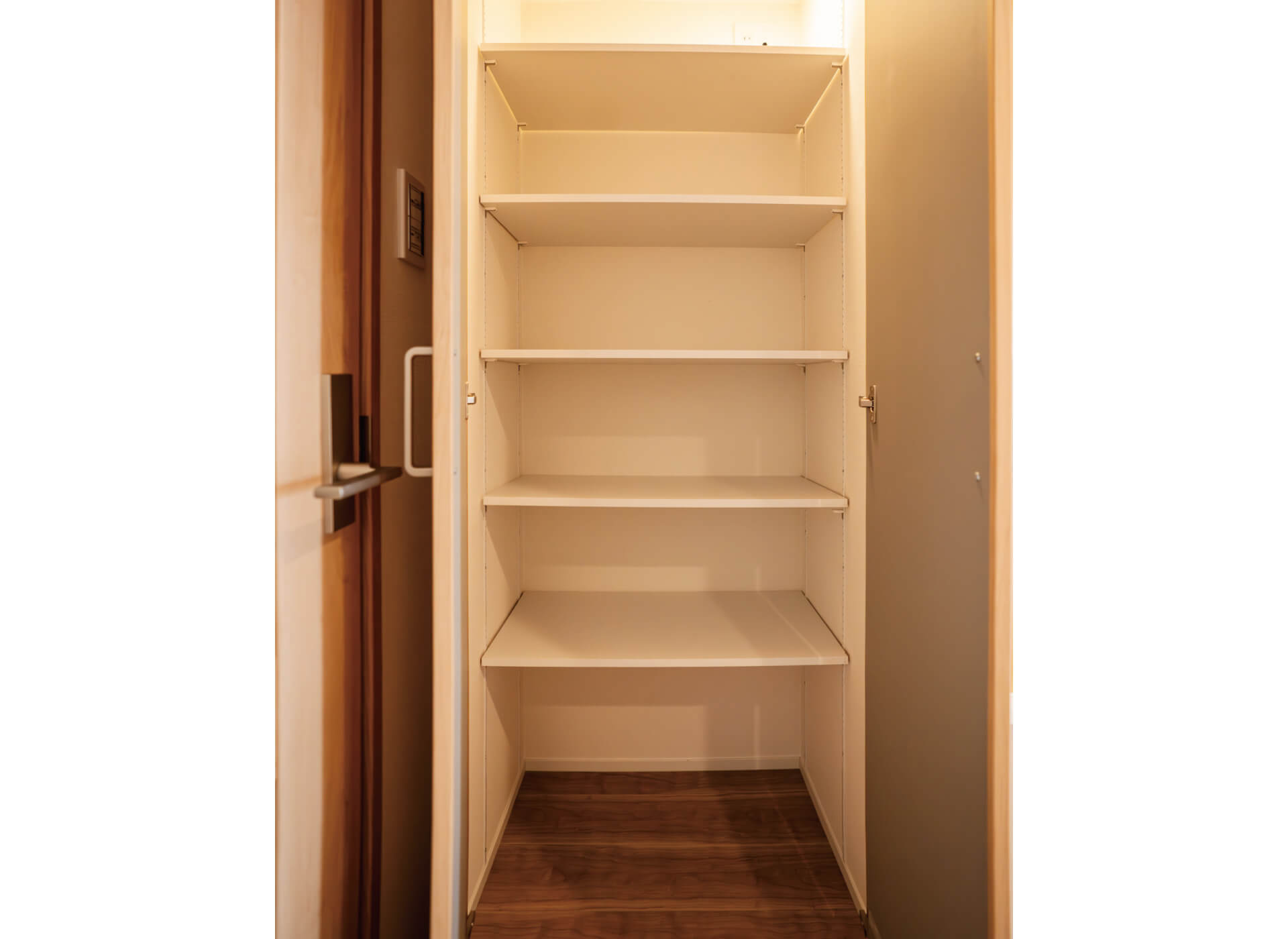 リビングドアを開けてすぐ左に設けた収納スペース。扉を開けると自動でダウンライトが点灯します。