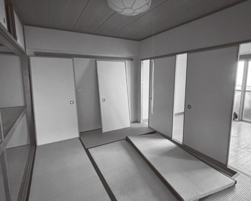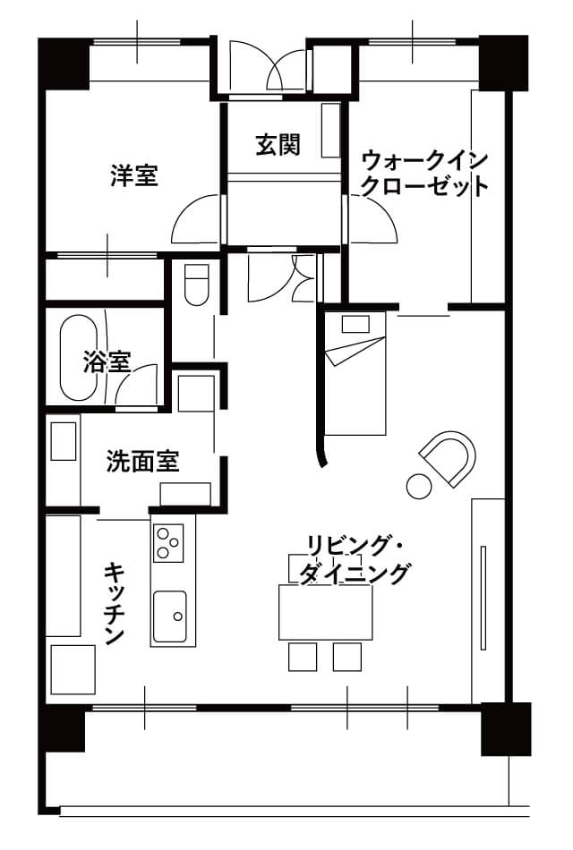 水廻りの老朽化と玄関の狭さがお悩みだったT様。同じマンションの眺望のよい別の住戸へ、住み替えとリフォームを決意されました。LDKにベッドコーナーを設け、目覚めとともに南側の景色を楽しめるように。回遊できる水廻りで、負担の少ない家事動線を実現しました。
