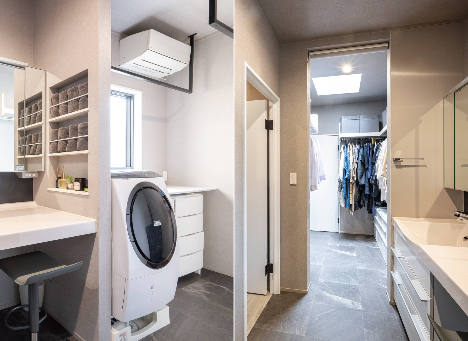 キッチン奥にランドリールームをつくり、回遊できるよう動線をつなげました。クローゼットにも直接行けるので、洗濯・乾燥・収納までスムーズに。