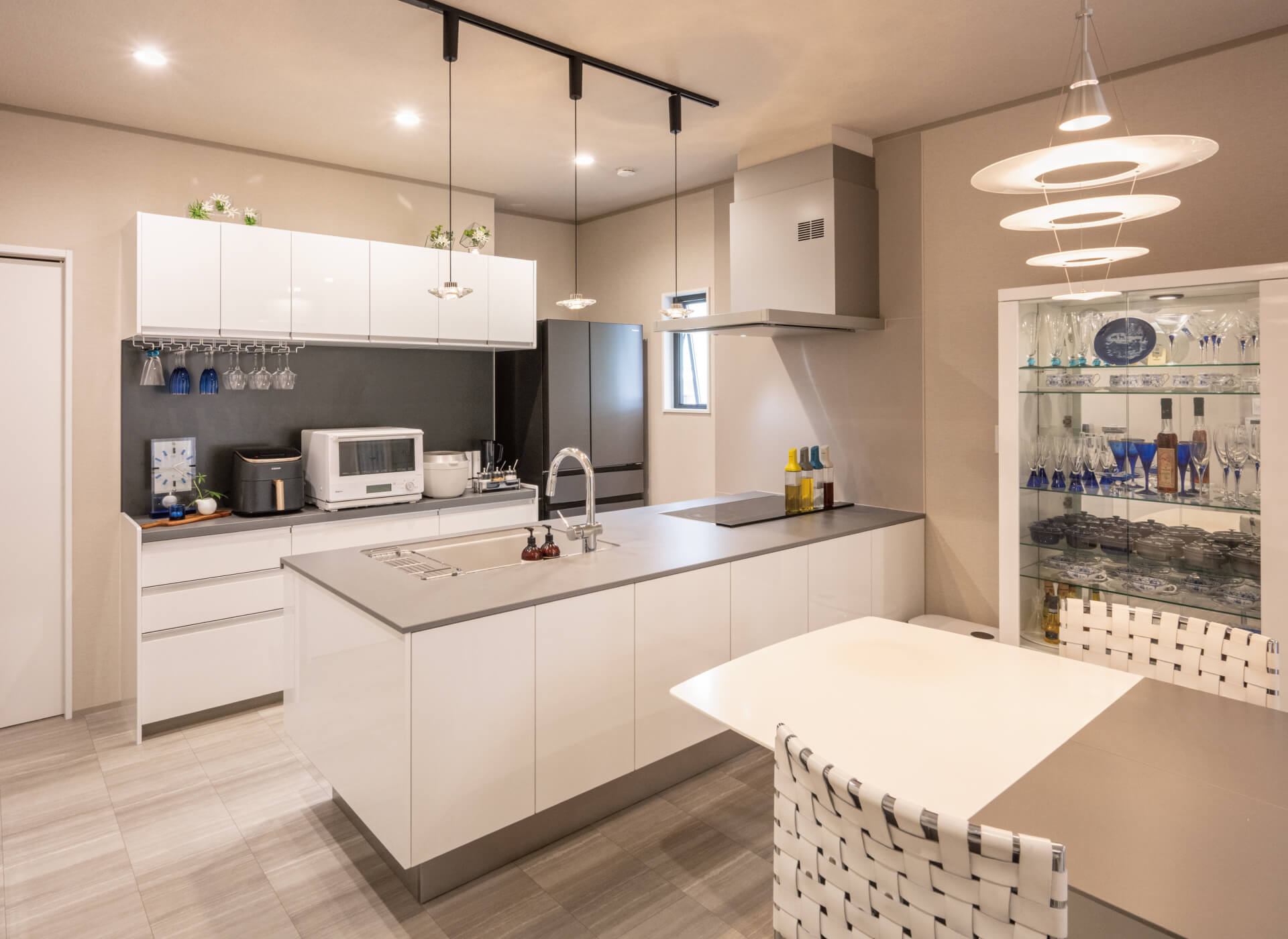 1階の親世帯のキッチンは、白を基調に明るく。冷蔵庫や置きたい家電の寸法を測り、ジャストサイズのカップボードに。