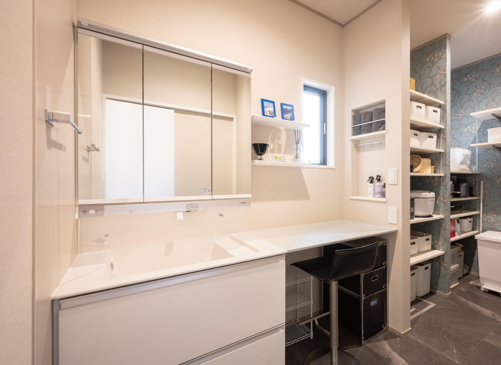 1階の洗面ドレッシングにはカウンターをプラス。メイクやスキンケアをゆったり座ってできるようにしました。