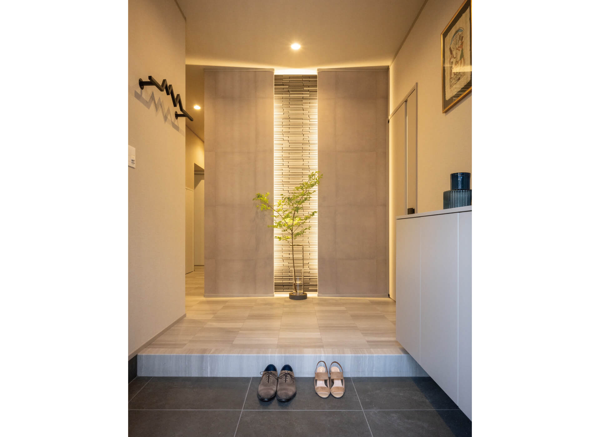 3つあった玄関を1つに。入ったときに間接照明とタイルで彩った壁がパッと目を引く住まいの顔をつくりました。