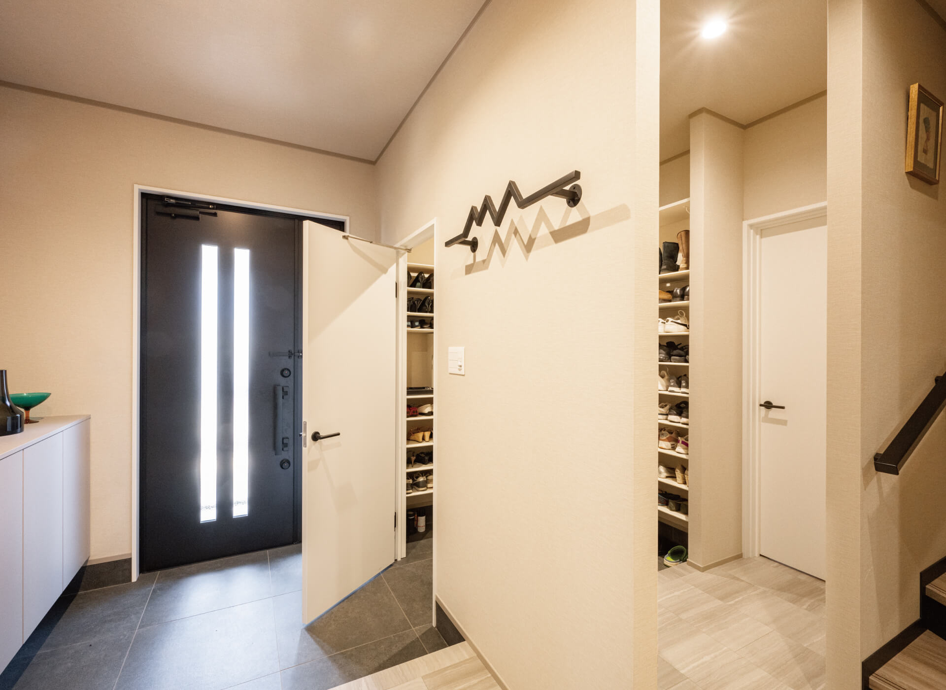 ウォークスルー型のシューズクローク。6人分の靴をたっぷり仕舞えるので、すっきりした玄関に。
